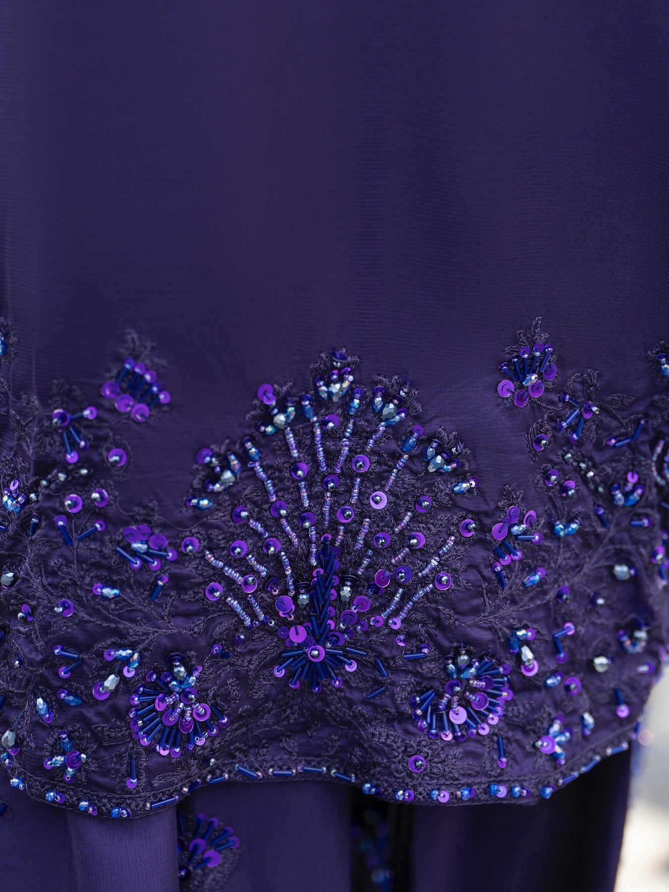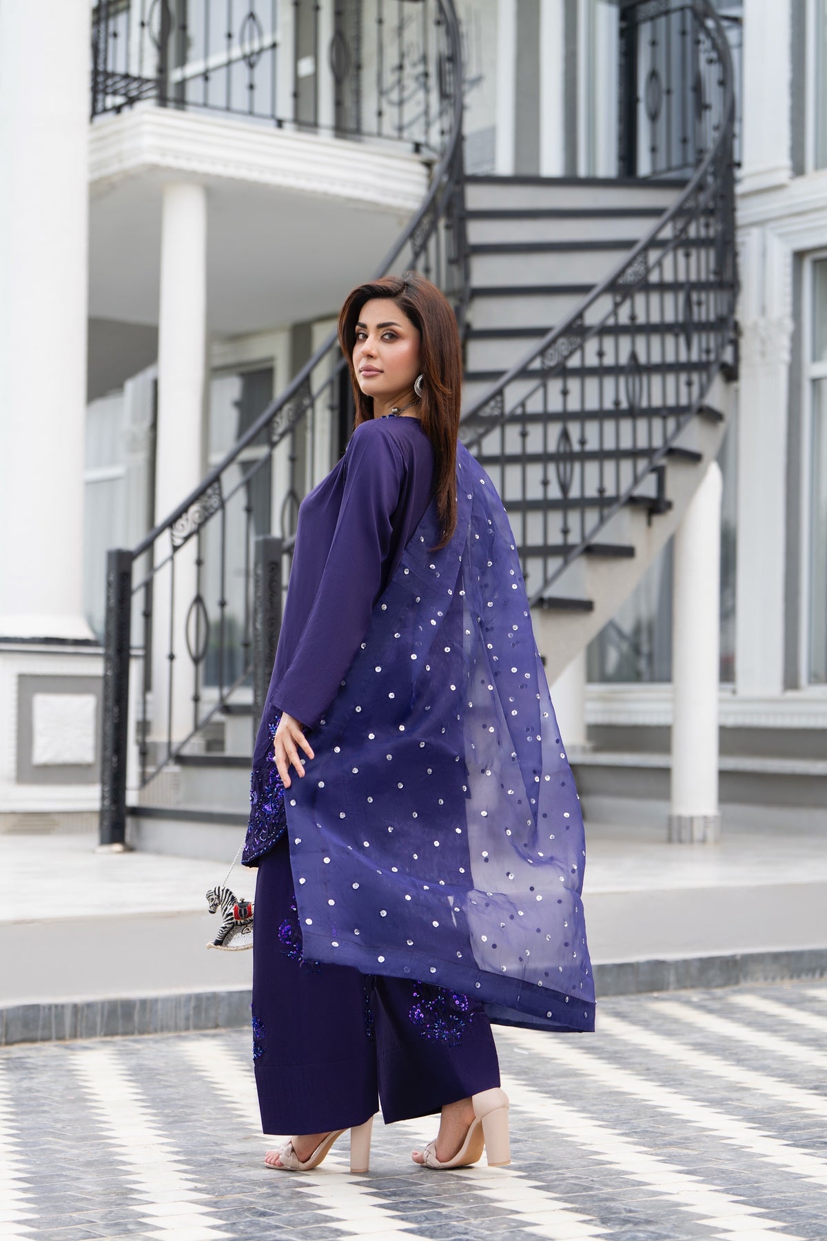 A timeless ensemble crafted from premium silk fabric in a rich shocking pink hue. The outfit features a classic straight shirt paired with an intricately hand-embellished farshi shalwar, adding an elegant flair. The organza dupatta is adorned with delicate sequins, completing the look with sheer grace. Perfect for festive occasions and evening gatherings.