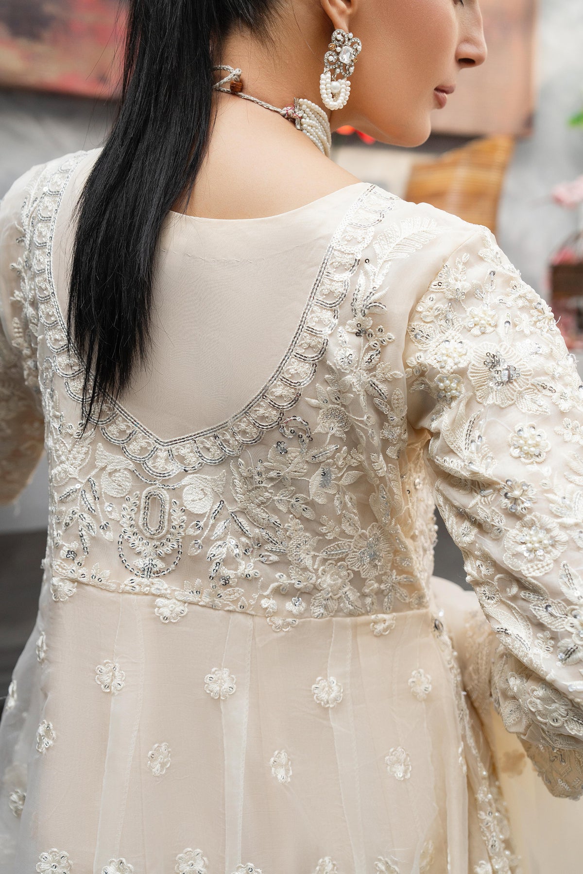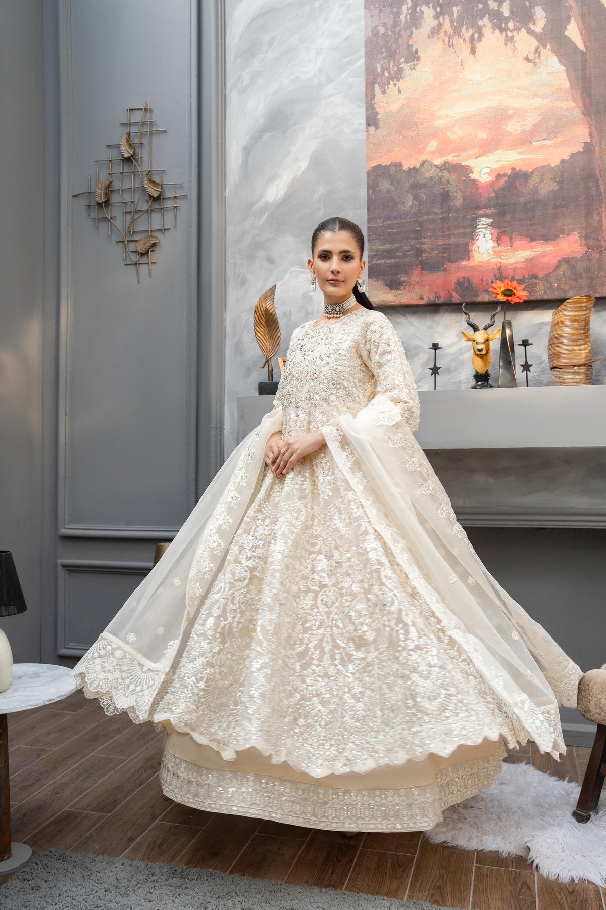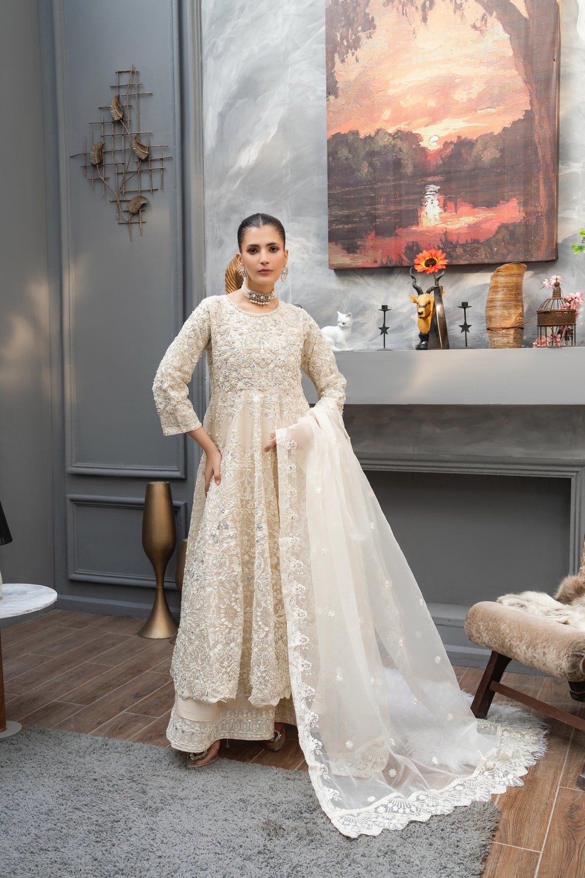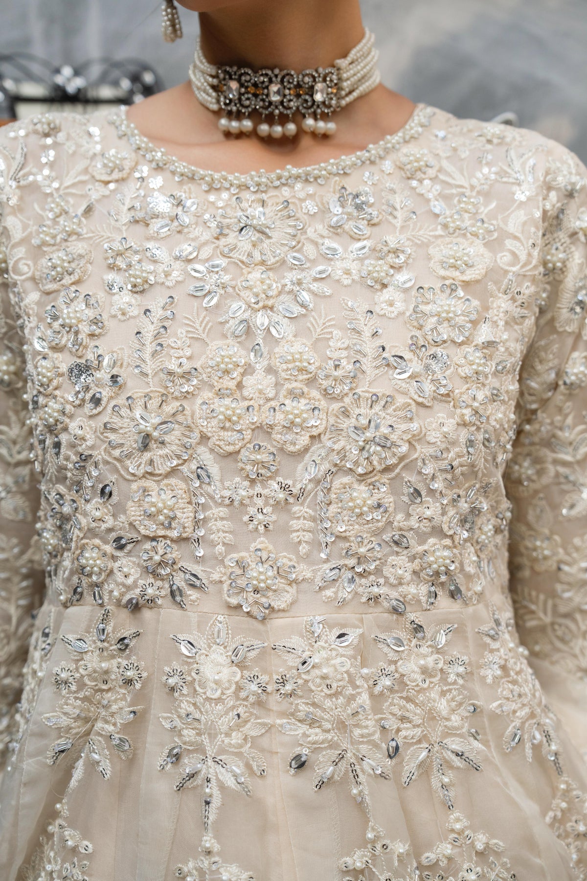 In a stunning ivory hue, Ayeza is a masterpiece of timeless elegance. The ensemble is lavishly adorned with intricate embroidery, pearls, and sequins that shimmer with every movement. Paired with a delicately embroidered dupatta, this graceful outfit is the epitome of luxury—ideal for weddings, receptions, and occasions where sophistication is the true statement.