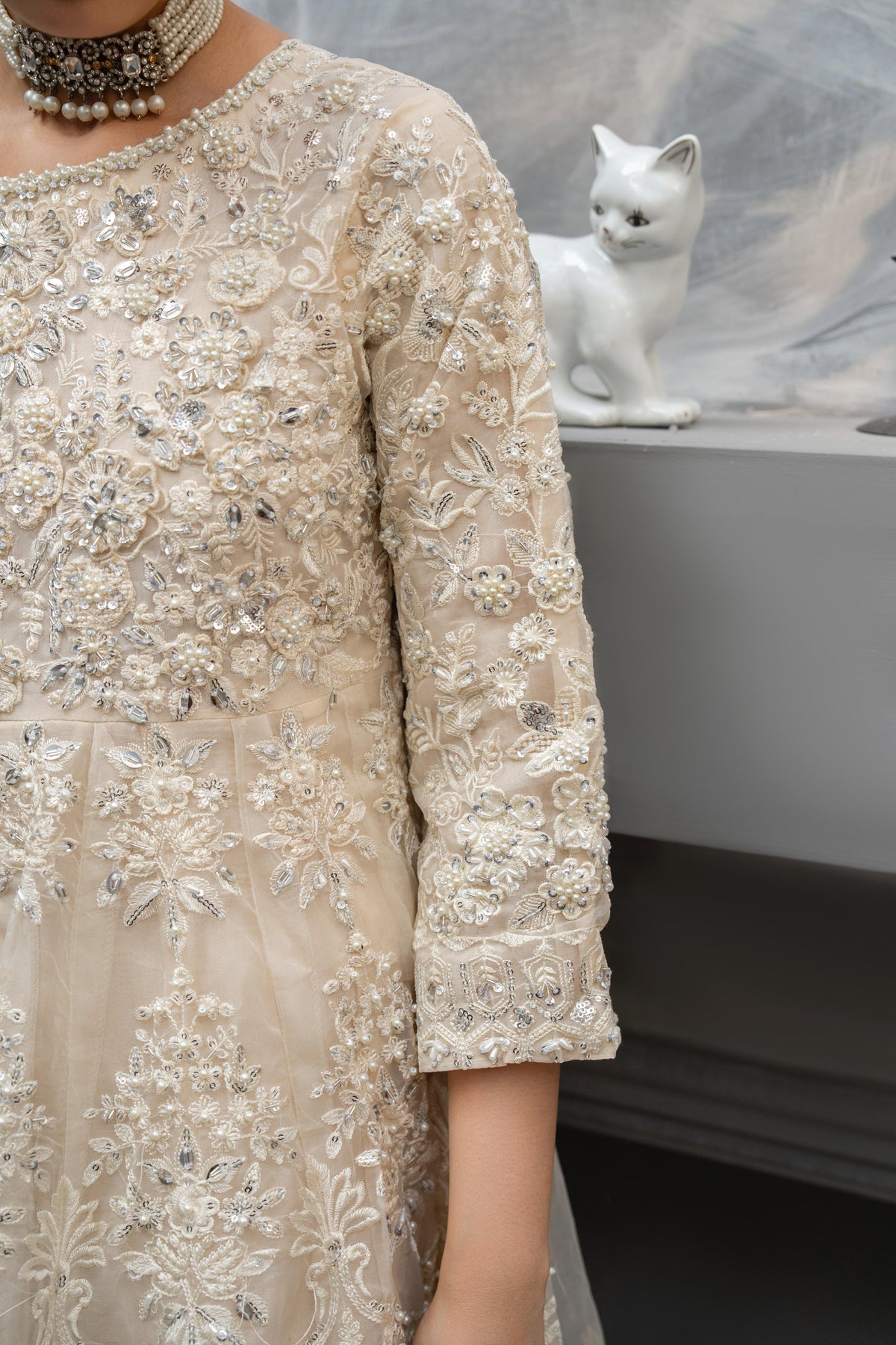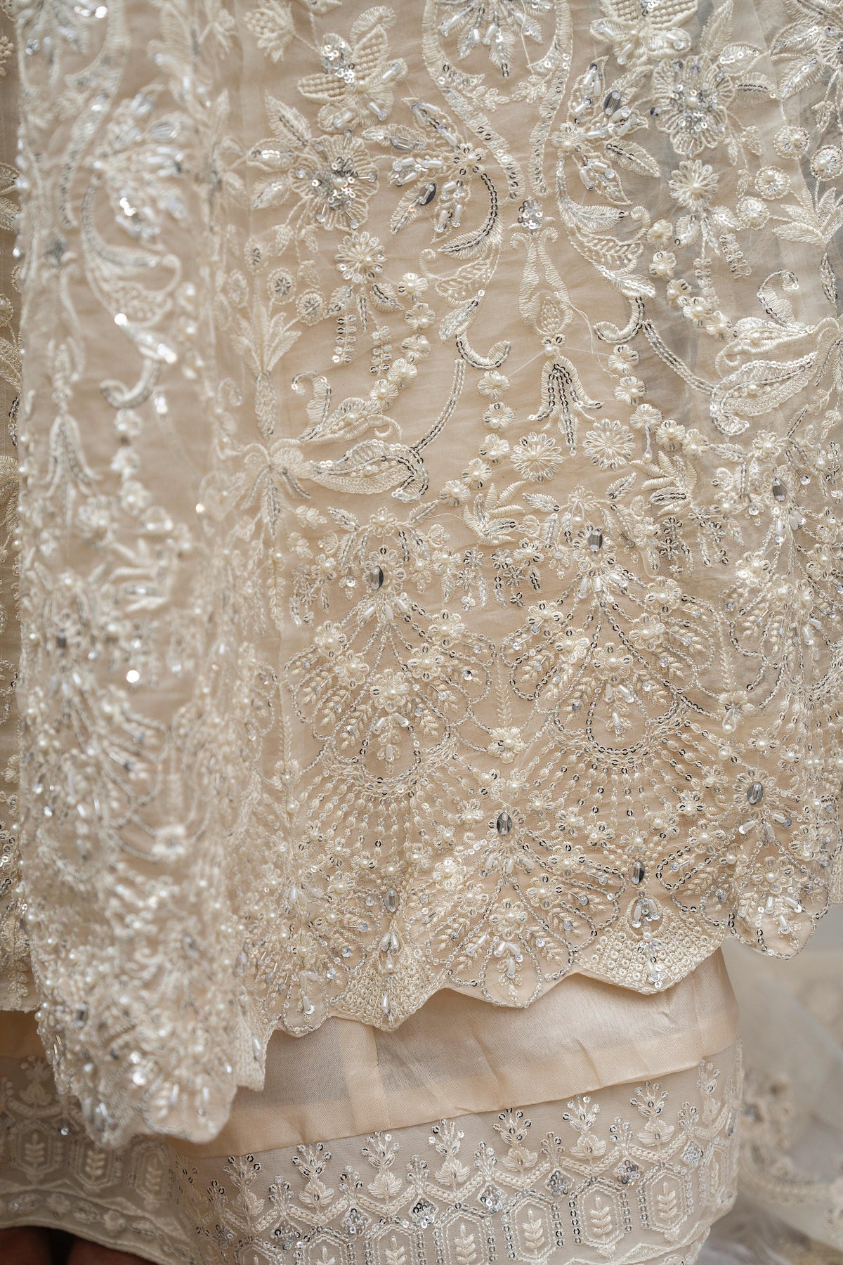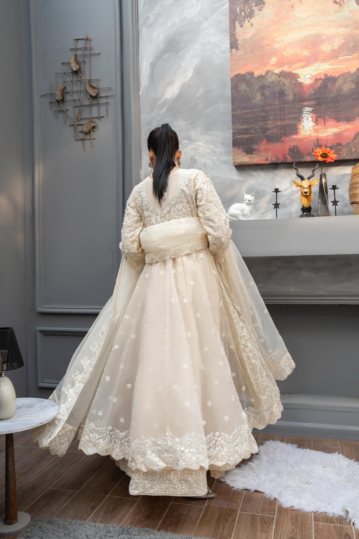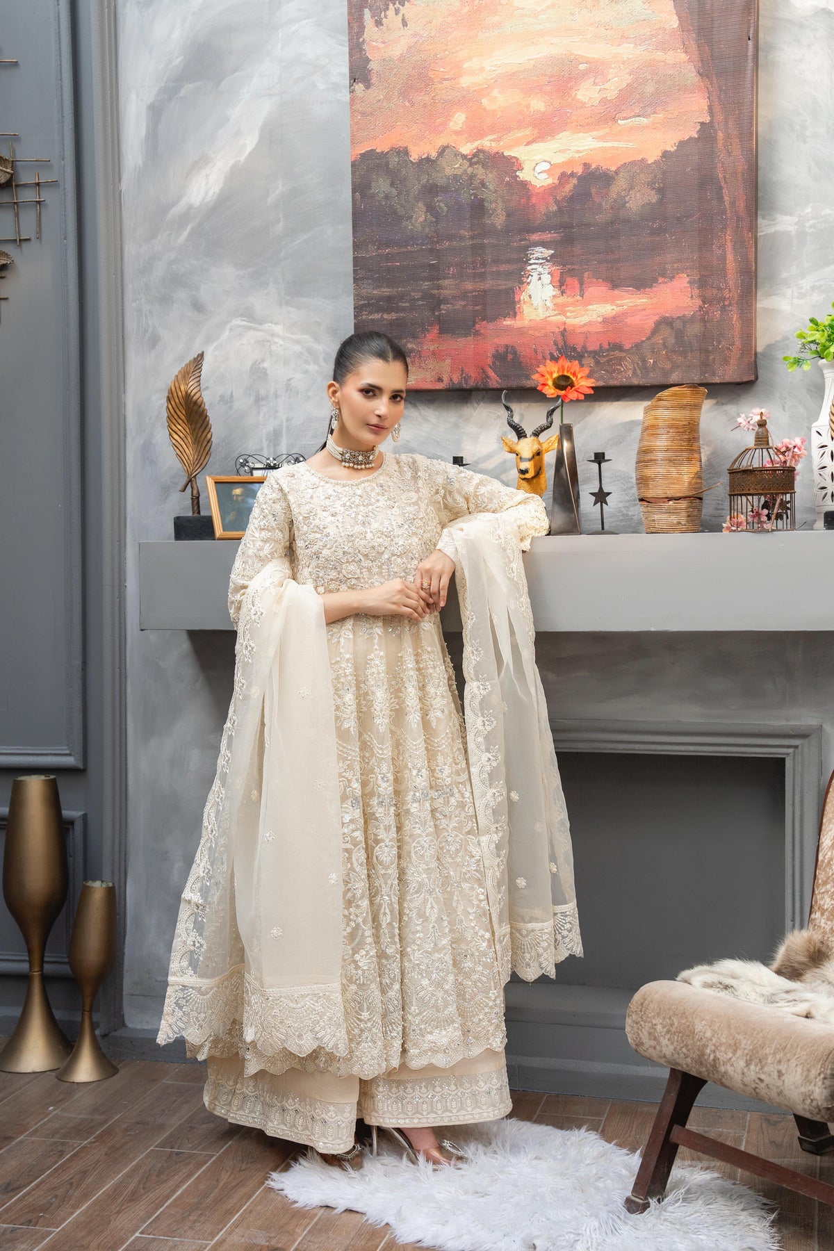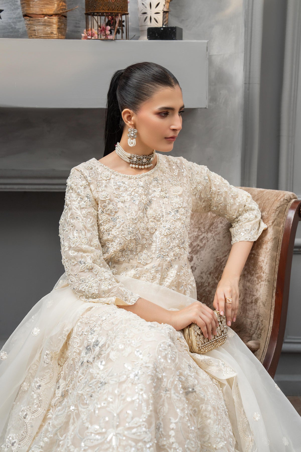 In a stunning ivory hue, Ayeza is a masterpiece of timeless elegance. The ensemble is lavishly adorned with intricate embroidery, pearls, and sequins that shimmer with every movement. Paired with a delicately embroidered dupatta, this graceful outfit is the epitome of luxury—ideal for weddings, receptions, and occasions where sophistication is the true statement.