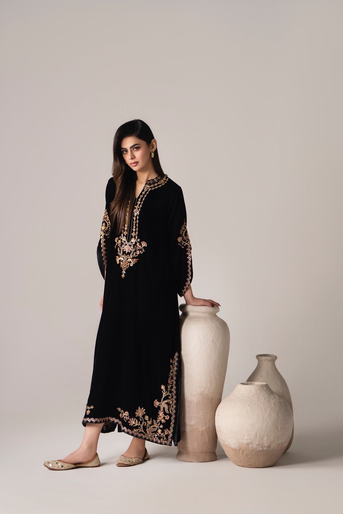 • Color: Deep Black• Fabric: Luxe velvet with a rich, royal fall• Silhouette: Classic straight kaftan cut• Neckline: Heavily embellished V-neck with antique gold embroidery• Sleeves: Relaxed wide sleeves with embroidered accents• Hem: Ornate floral embroidery detailing at the border• Vibe: Regal, bold & timeless