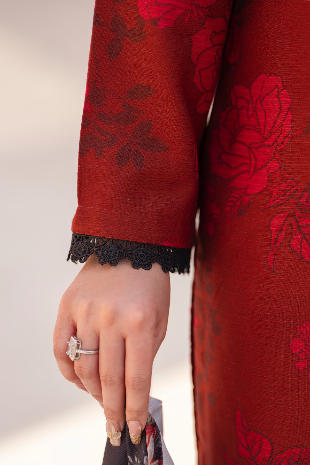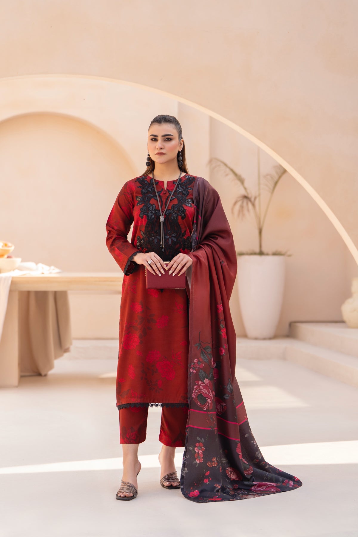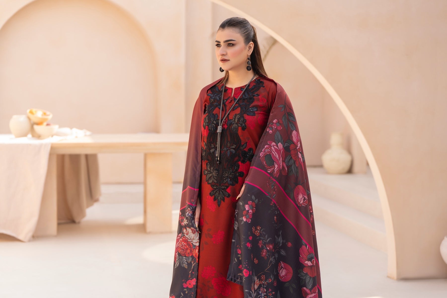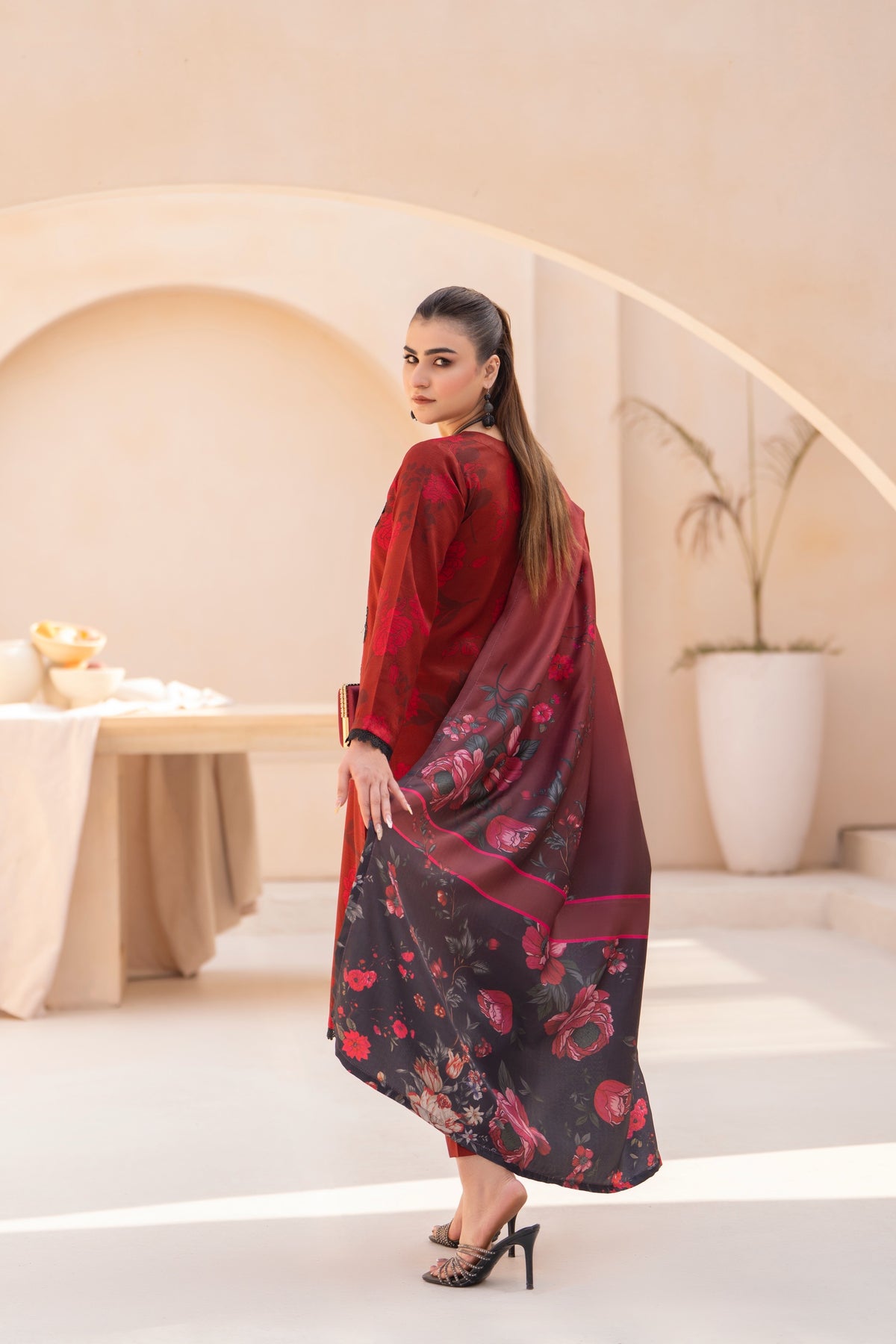 Rich crimson tones highlighted with bold black embroidery on the neckline. The ombré floral wool shawl completes the look with warmth and sophistication — ideal for festive winter gatherings.