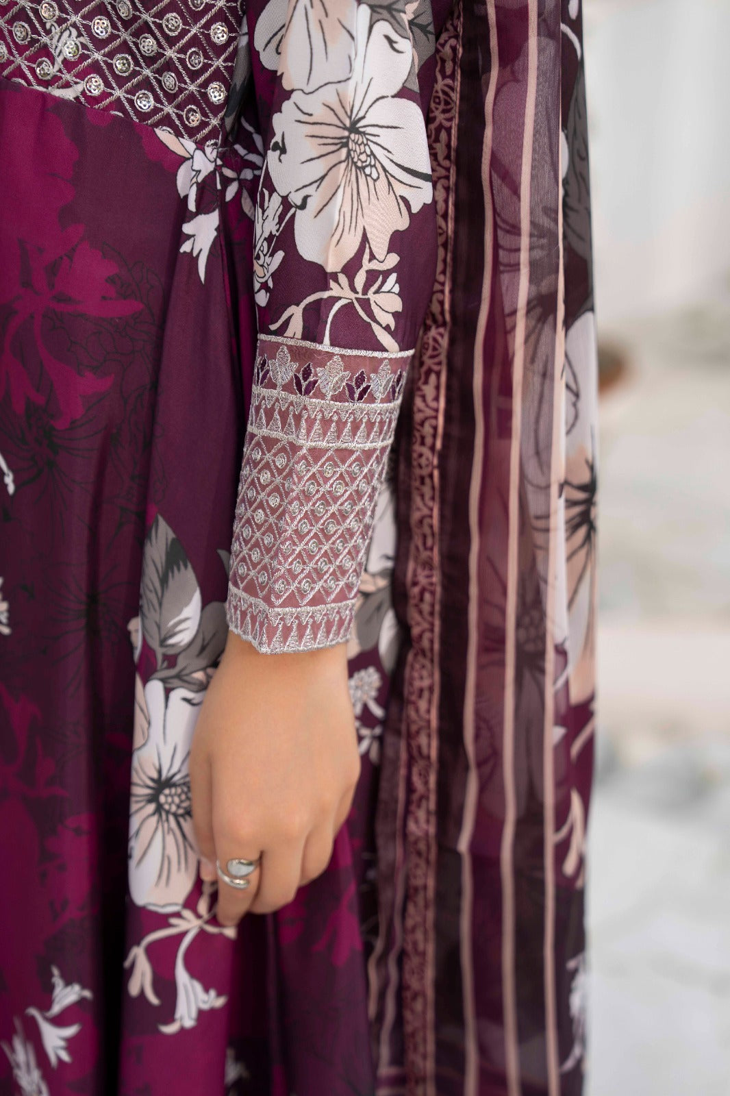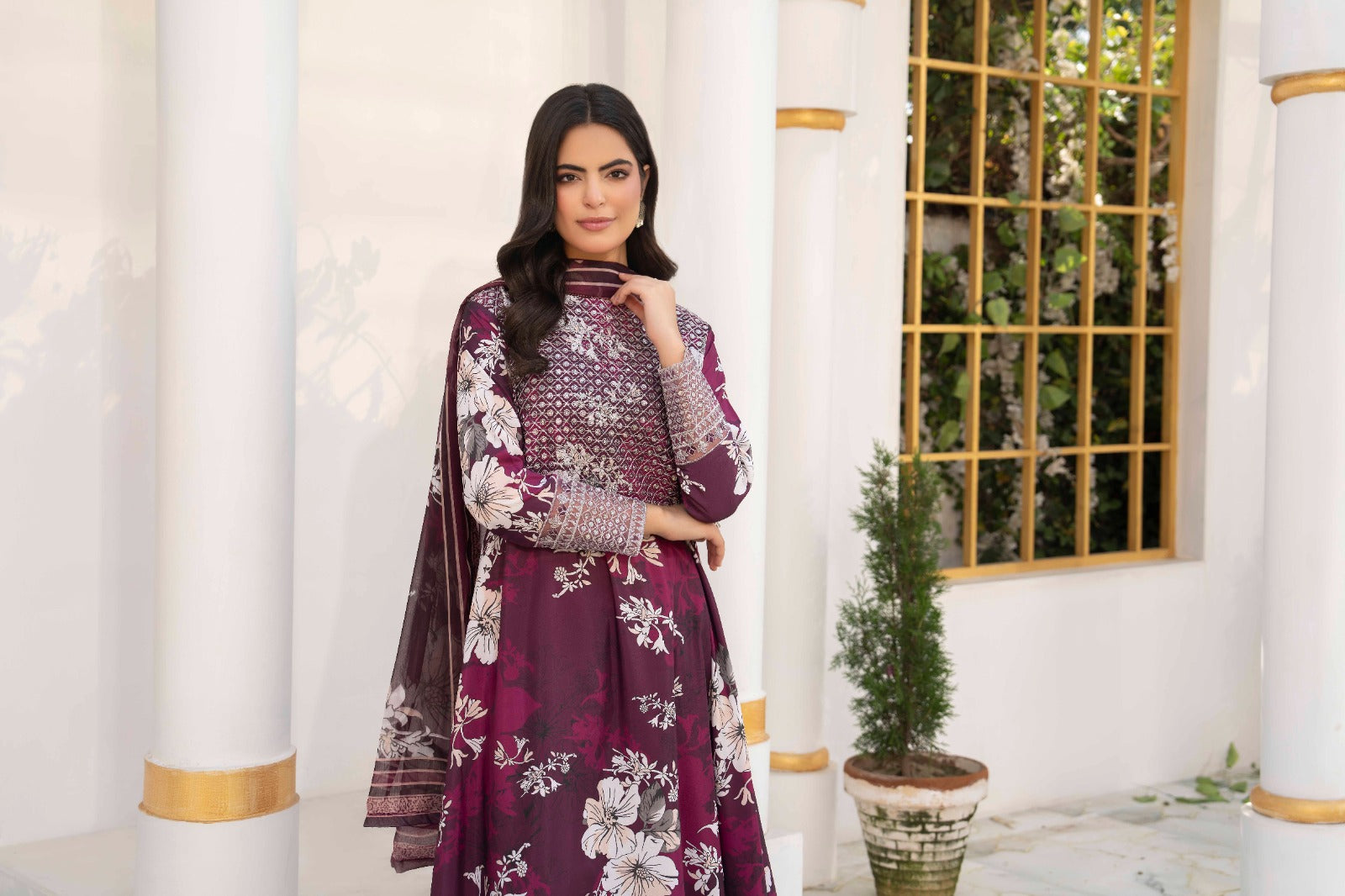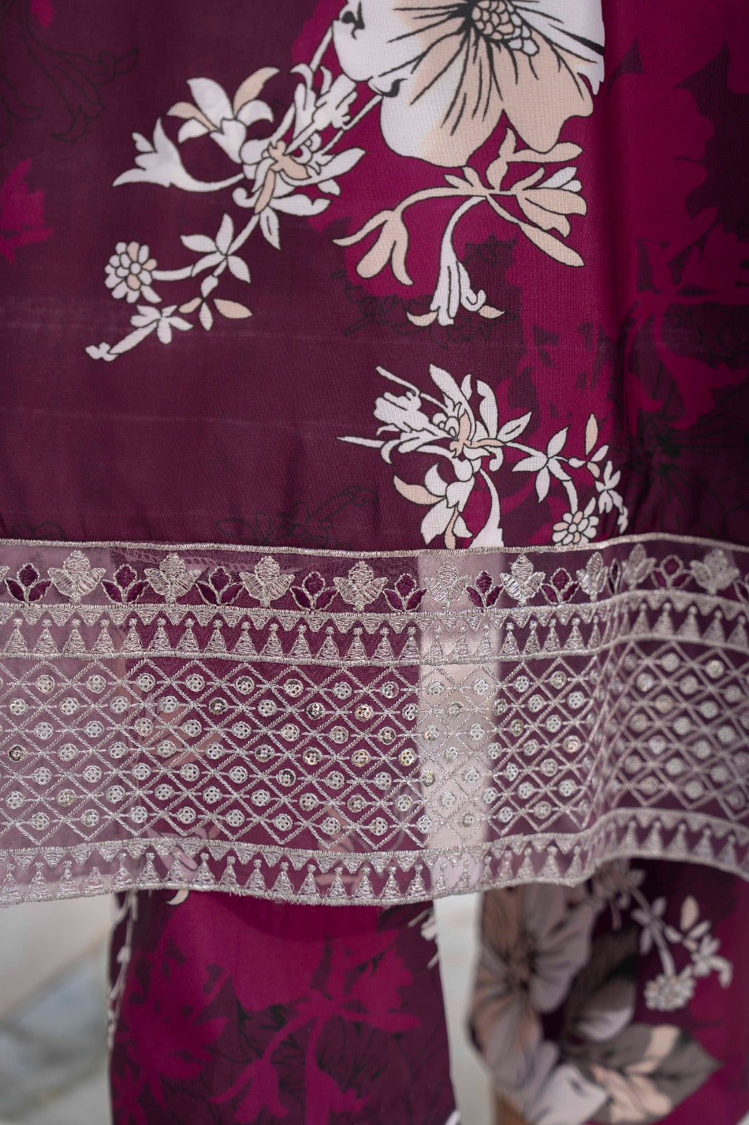 A deep crimson silk lawn set featuring delicate ivory floral prints, enhanced with detailed patterns on the shirt .