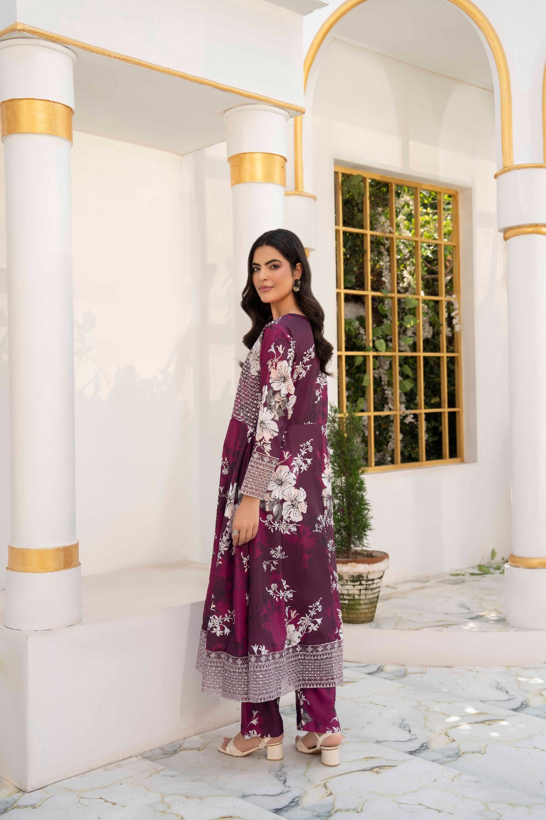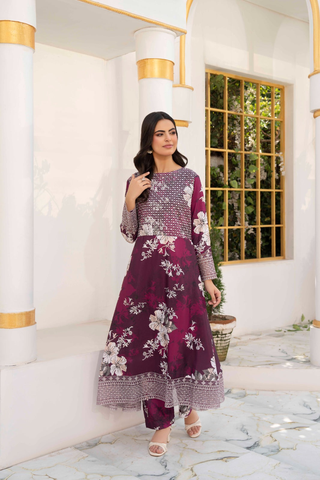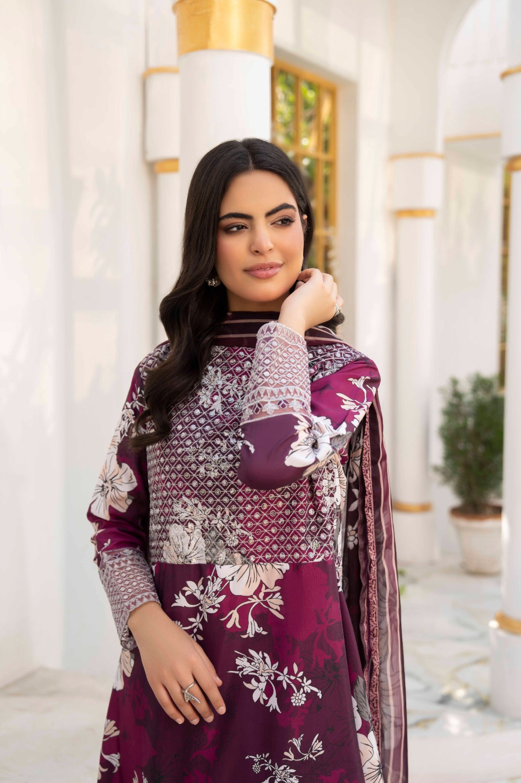 A deep crimson silk lawn set featuring delicate ivory floral prints, enhanced with detailed patterns on the shirt .