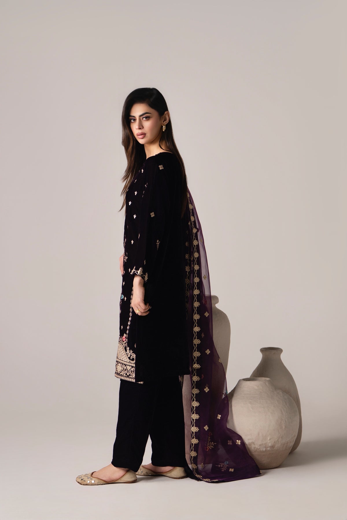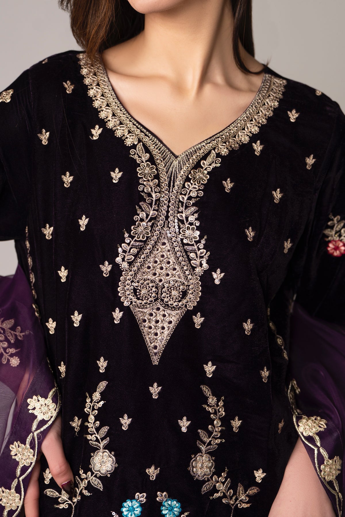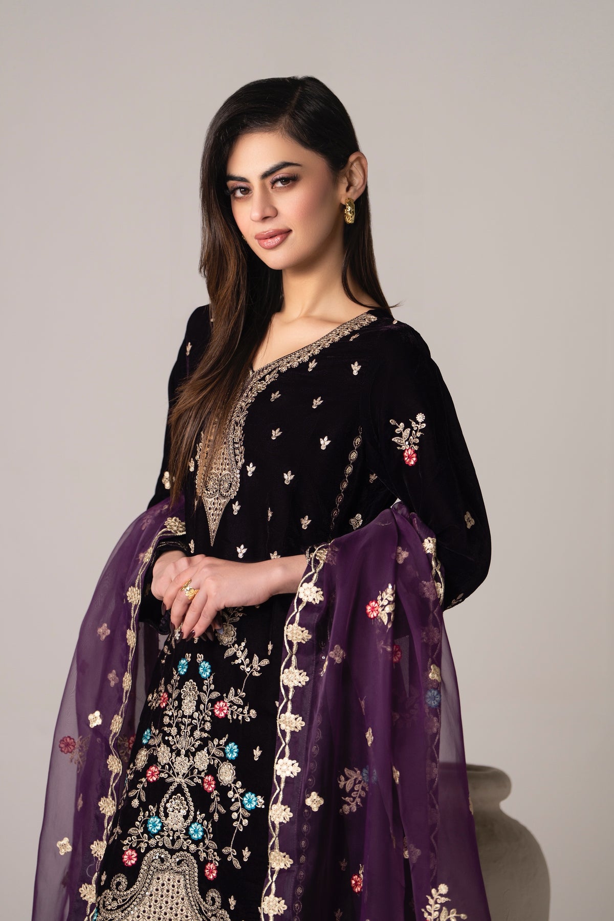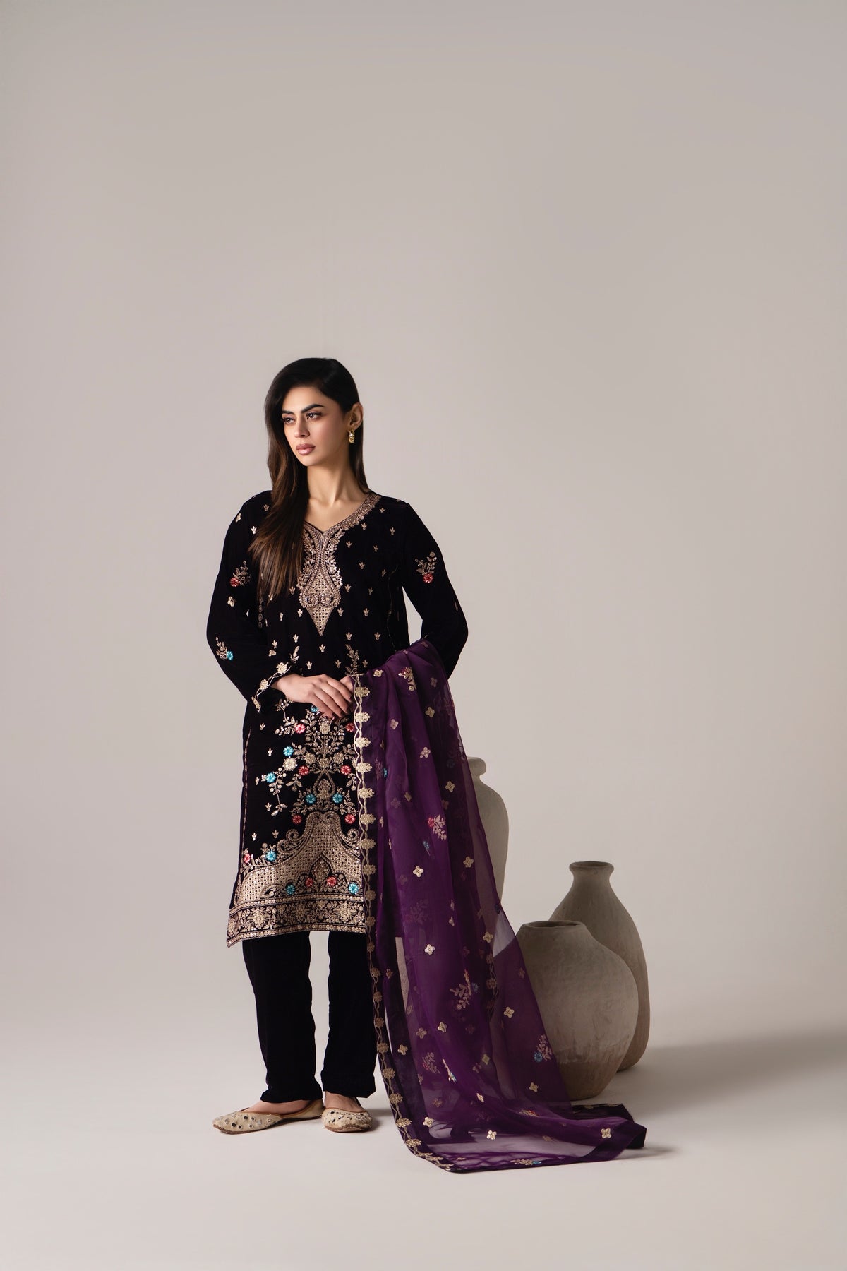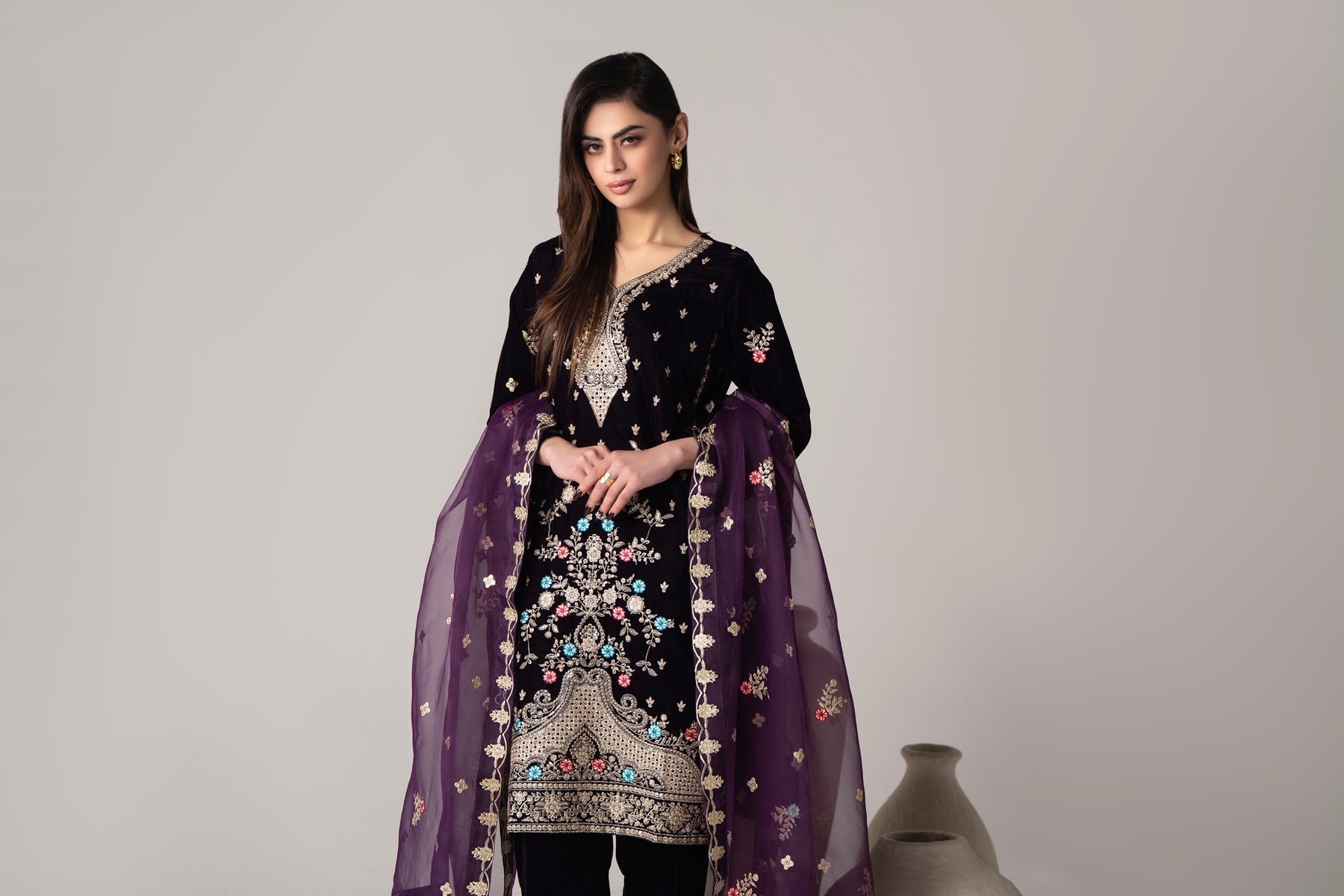 A deep plum velvet three-piece paired with rich embroidery and a plum organza dupatta , made to stand out ✨