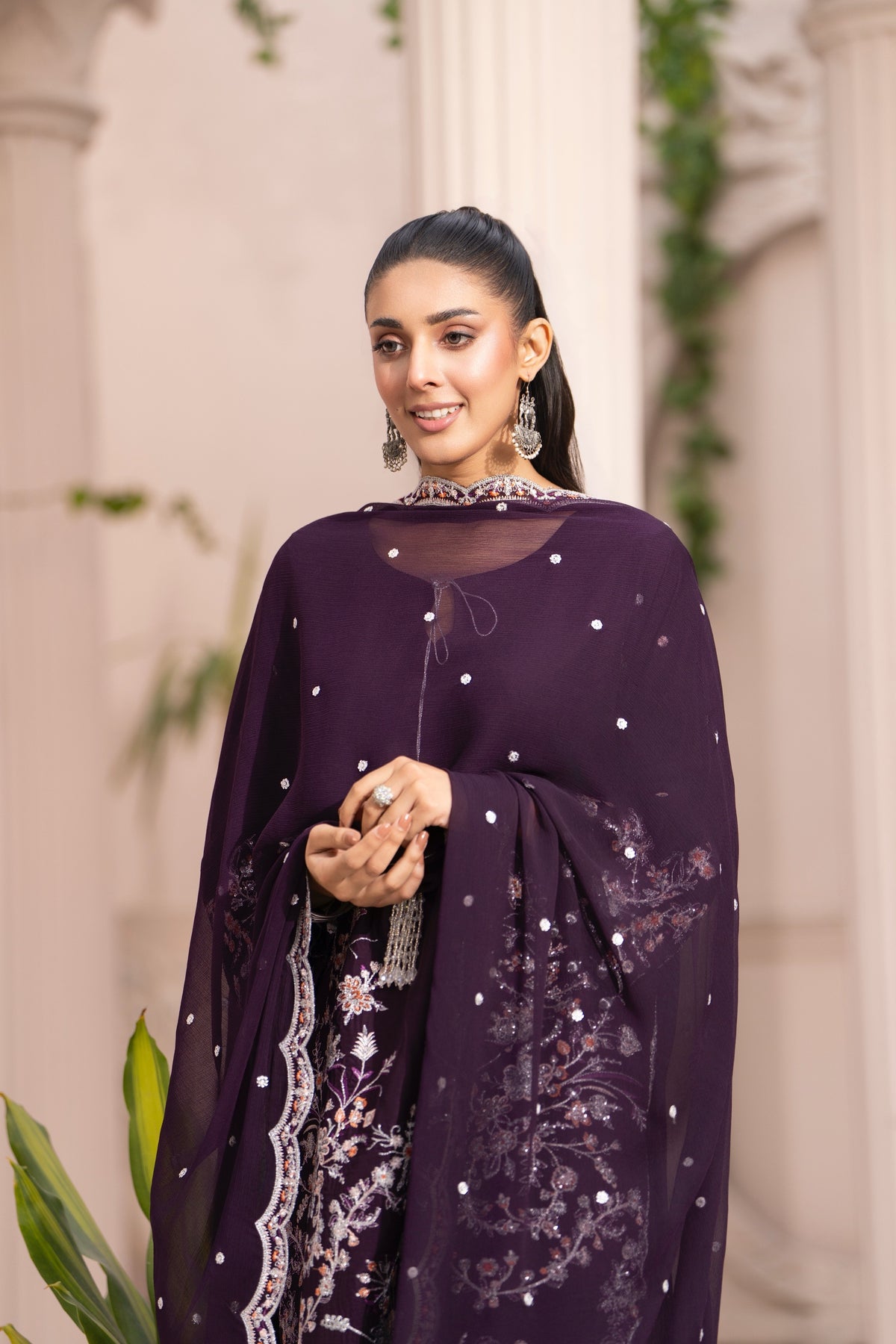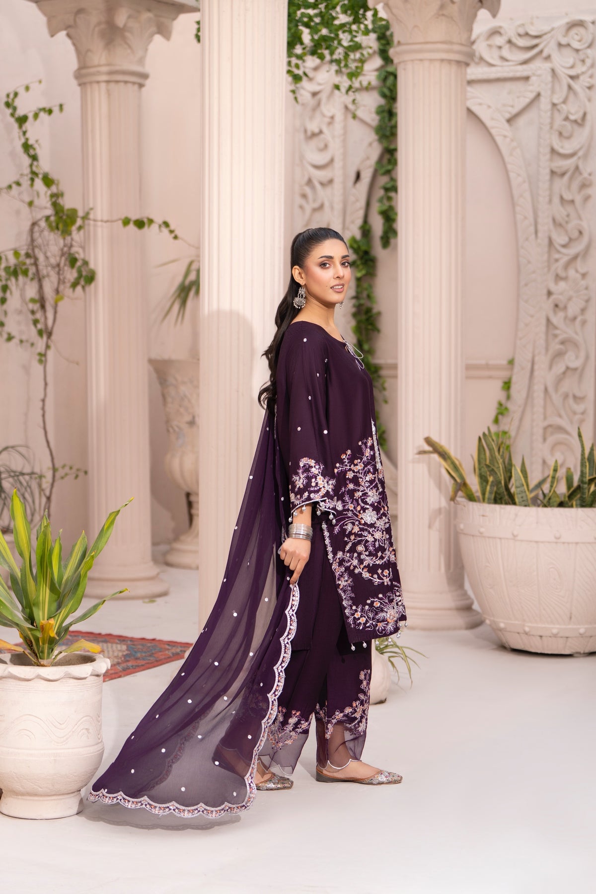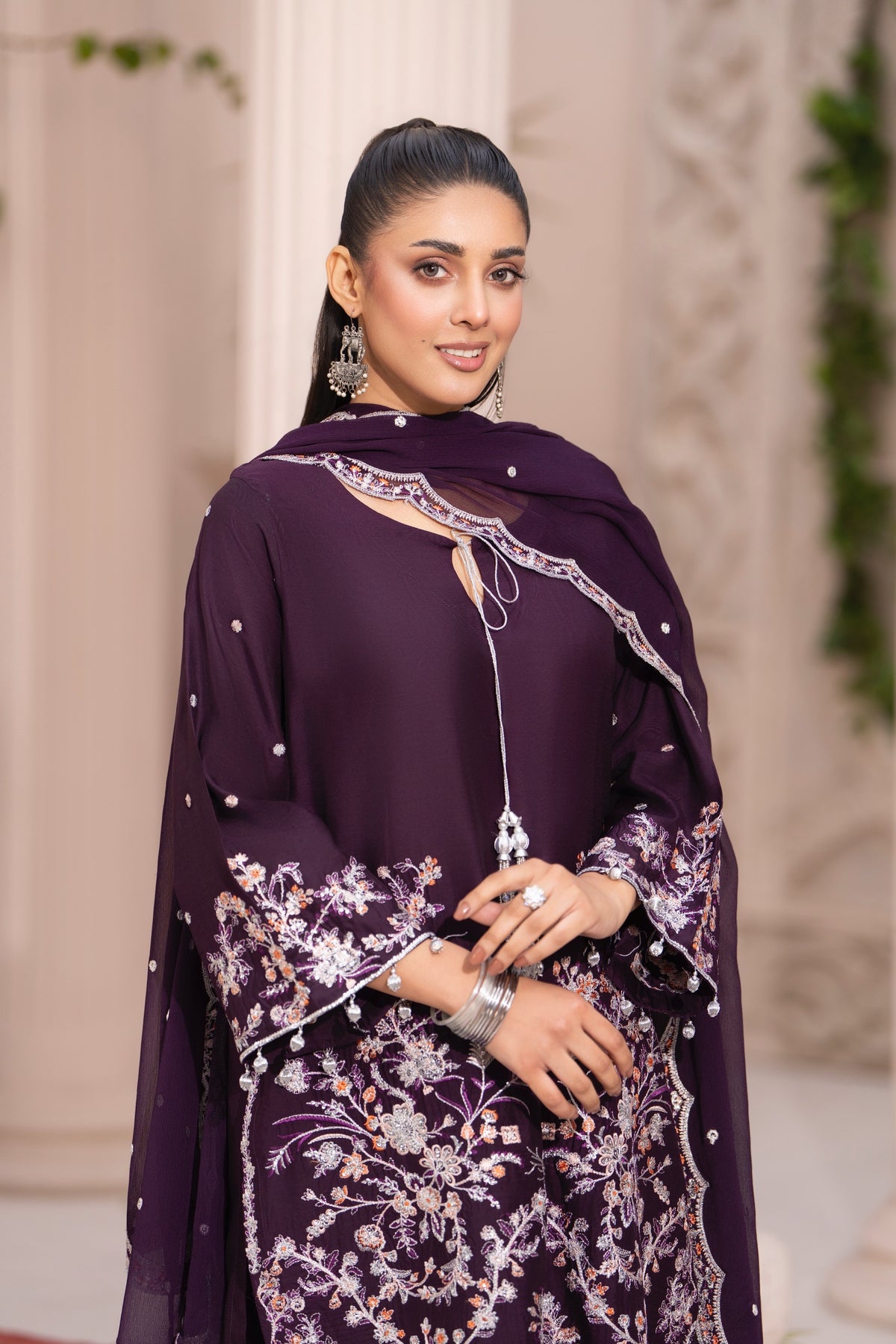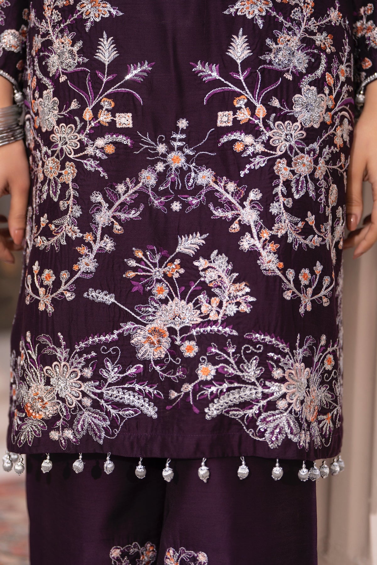 Fabric: Premium Viscose Shirt & Trousers; Fine Chiffon Dupatta.• Color: Deep Plum / Aubergine.• Embellishments: Silver and peach threadwork, sequins, silver bead tassels (latkan), and organza patchwork.• Details: Keyhole neck with string tie; sheer embroidered trouser cuffs.