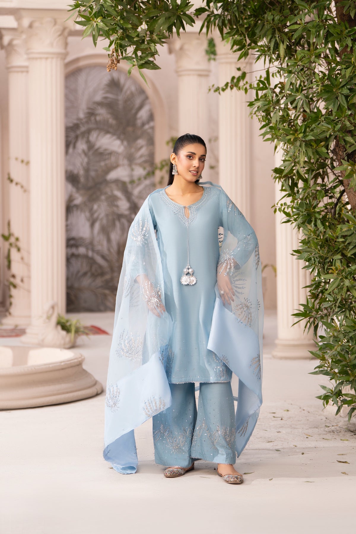 • Fabric: Premium Viscose (Shirt & Trouser) | Lightweight Sheer Dupatta.• Color: Powder Blue / Sky Blue.• Workmanship: Silver tilla embroidery, sequin embellishments, and silver "Gota" lace finishing.• Design Details: Curved hemline with silver lace, wide-leg trousers with heavy embroidery, and decorative tassels at the neck.