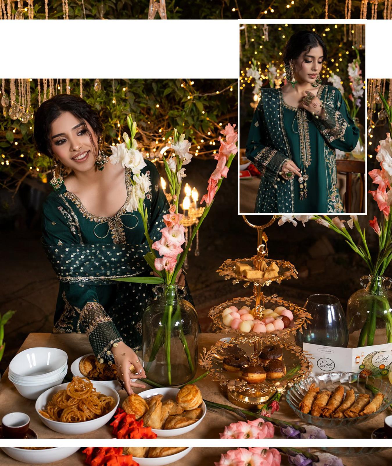 An elegant deep emerald green raw silk outfit featuring delicate gold embroidery on the neckline, sleeves, and hem. Paired with a graceful farshi-style shalwar and a beautifully embroidered net dupatta with intricate borders. Perfect for Eid and festive occasions.