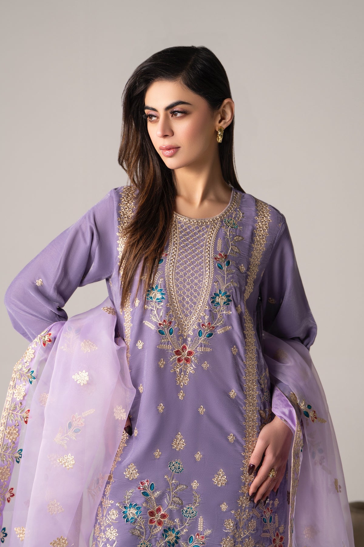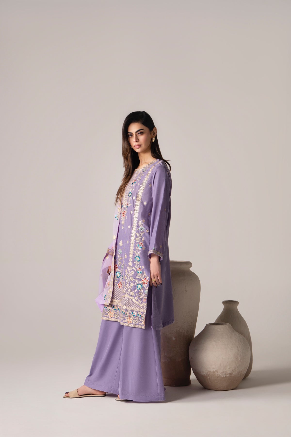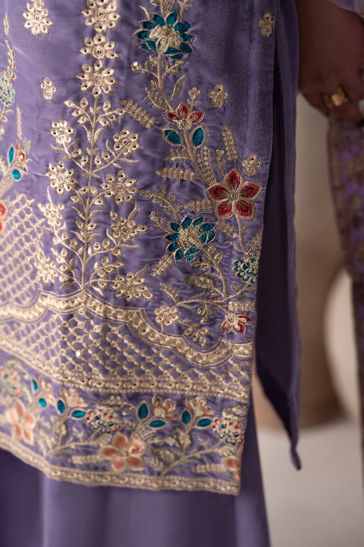 A three-piece velvet embroidered ensemble in a soothing lavender shade. The straight-cut kameez features intricate gold zari and multicolour floral embroidery on the neckline, front panel, borders, and sleeves, giving it a rich yet elegant finish. Paired with matching wide-leg trousers, keeping the look modern and flowy. The outfit is completed with a sheer organza dupatta, delicately embellished with gold motifs and floral accents, adding softness and movement to the overall look.