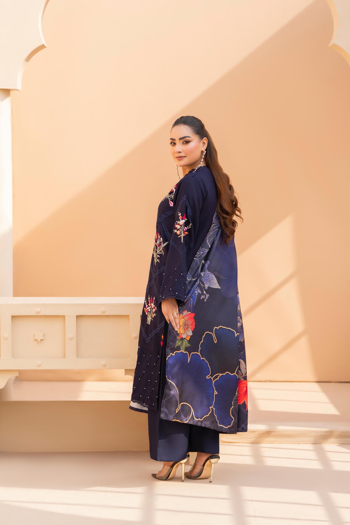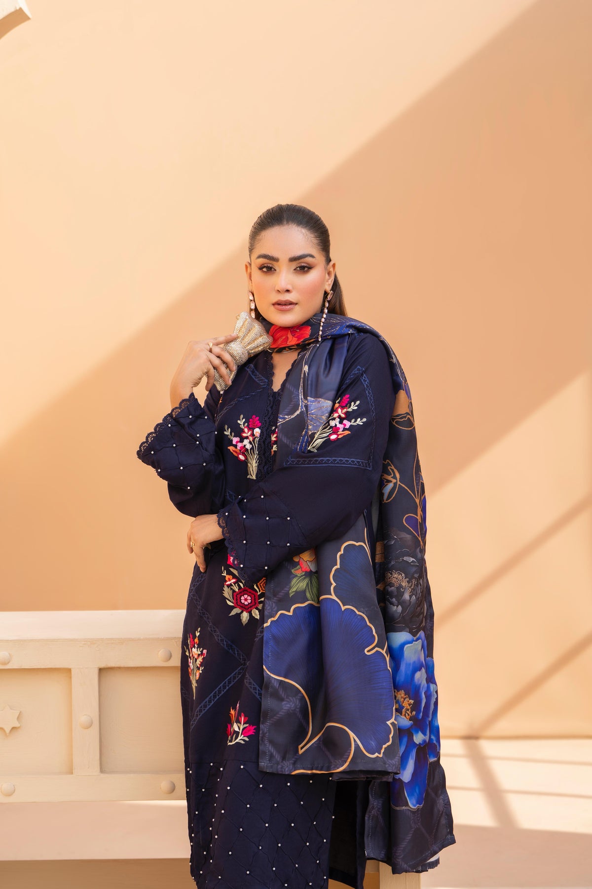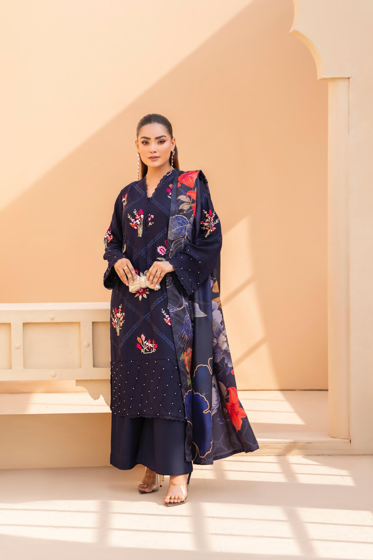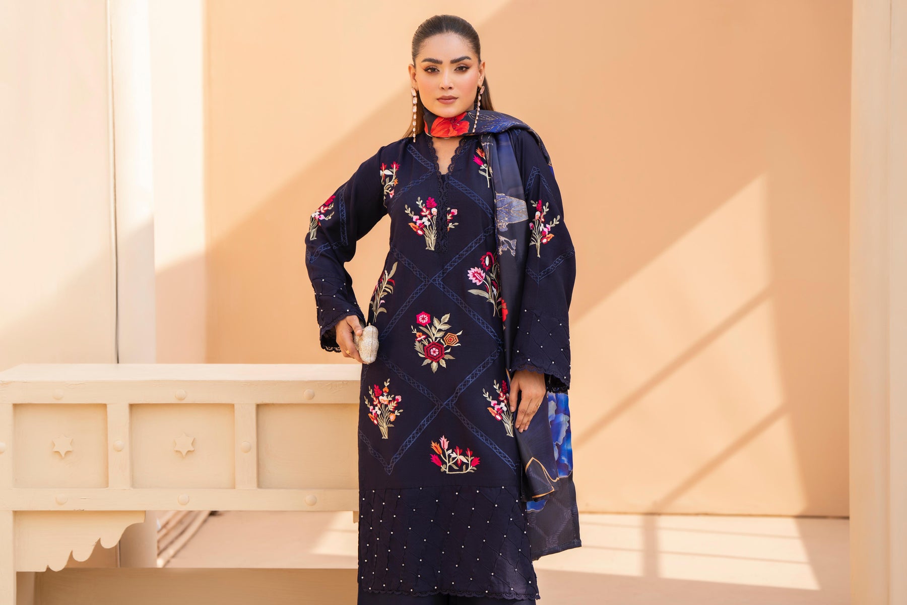A deep navy dhanak ensemble adorned with delicate floral embroidery and pearl accents, paired with a rich warm shawl featuring bold artistic blooms.
