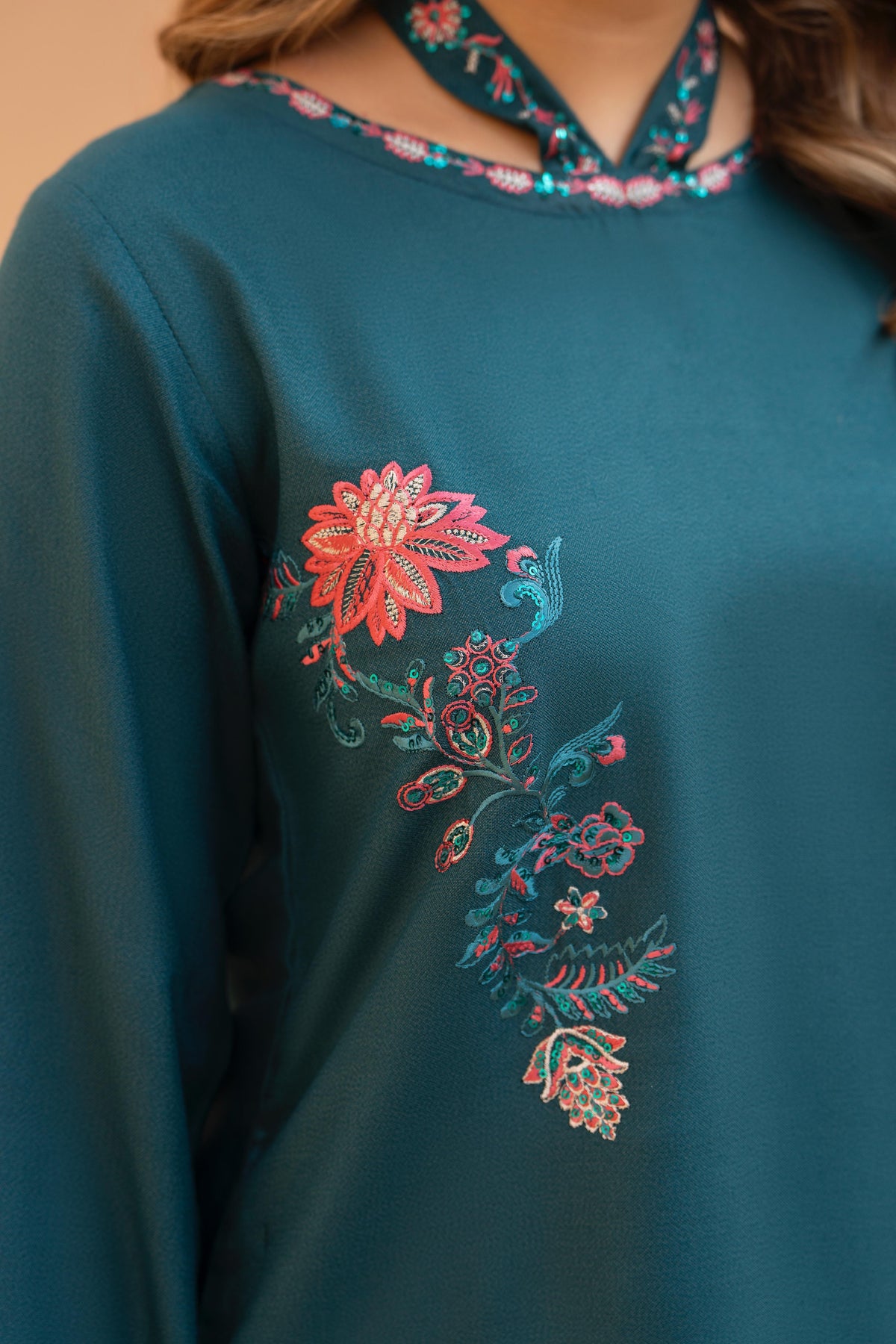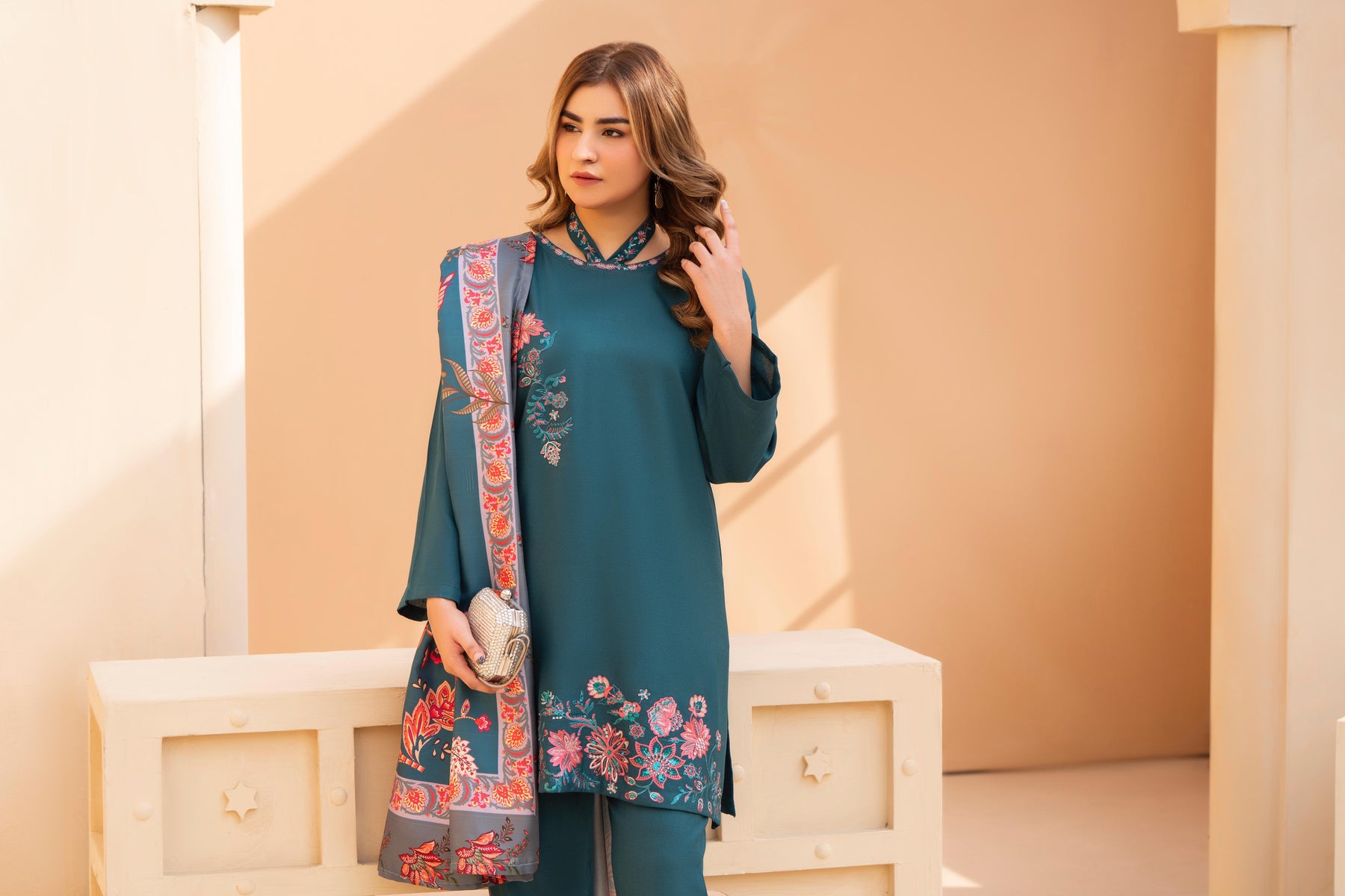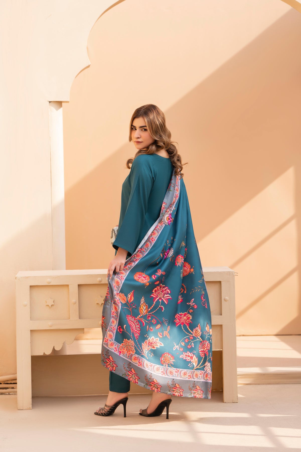 A serene teal dhanak ensemble adorned with delicate floral embroidery, paired with a beautifully printed warm shawl featuring romantic pink and coral tones.