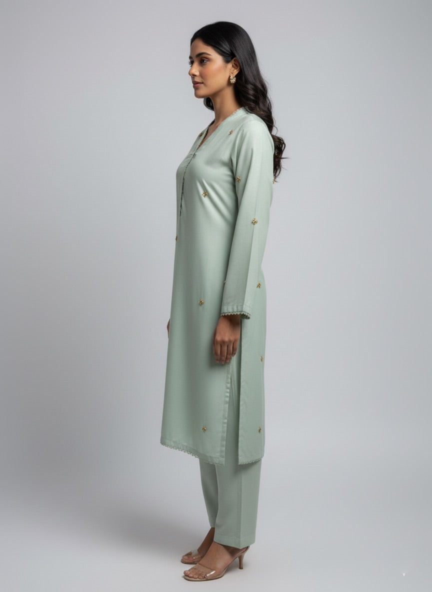 Refreshing mint tones crafted on premium winter Dhanak, finished with gold hand-embellished motifs.