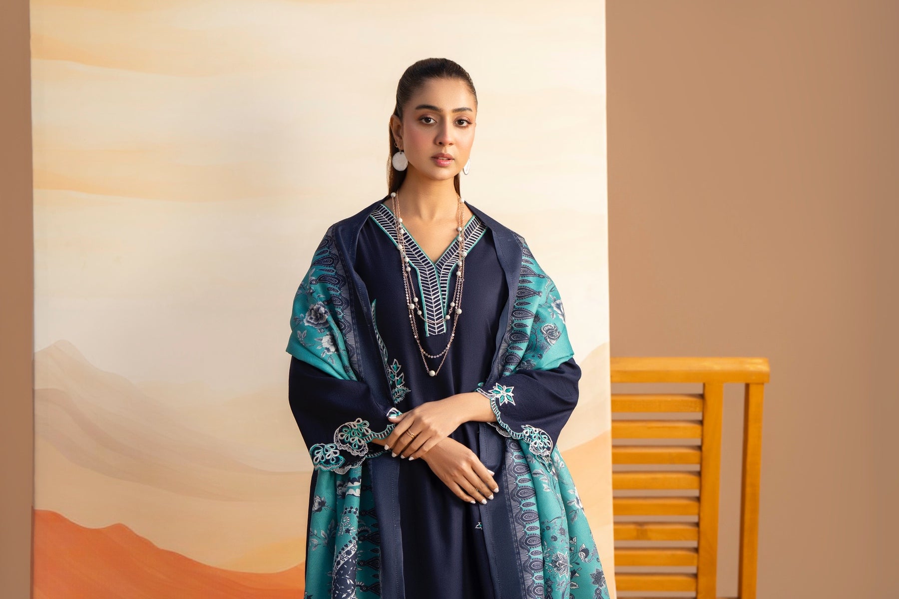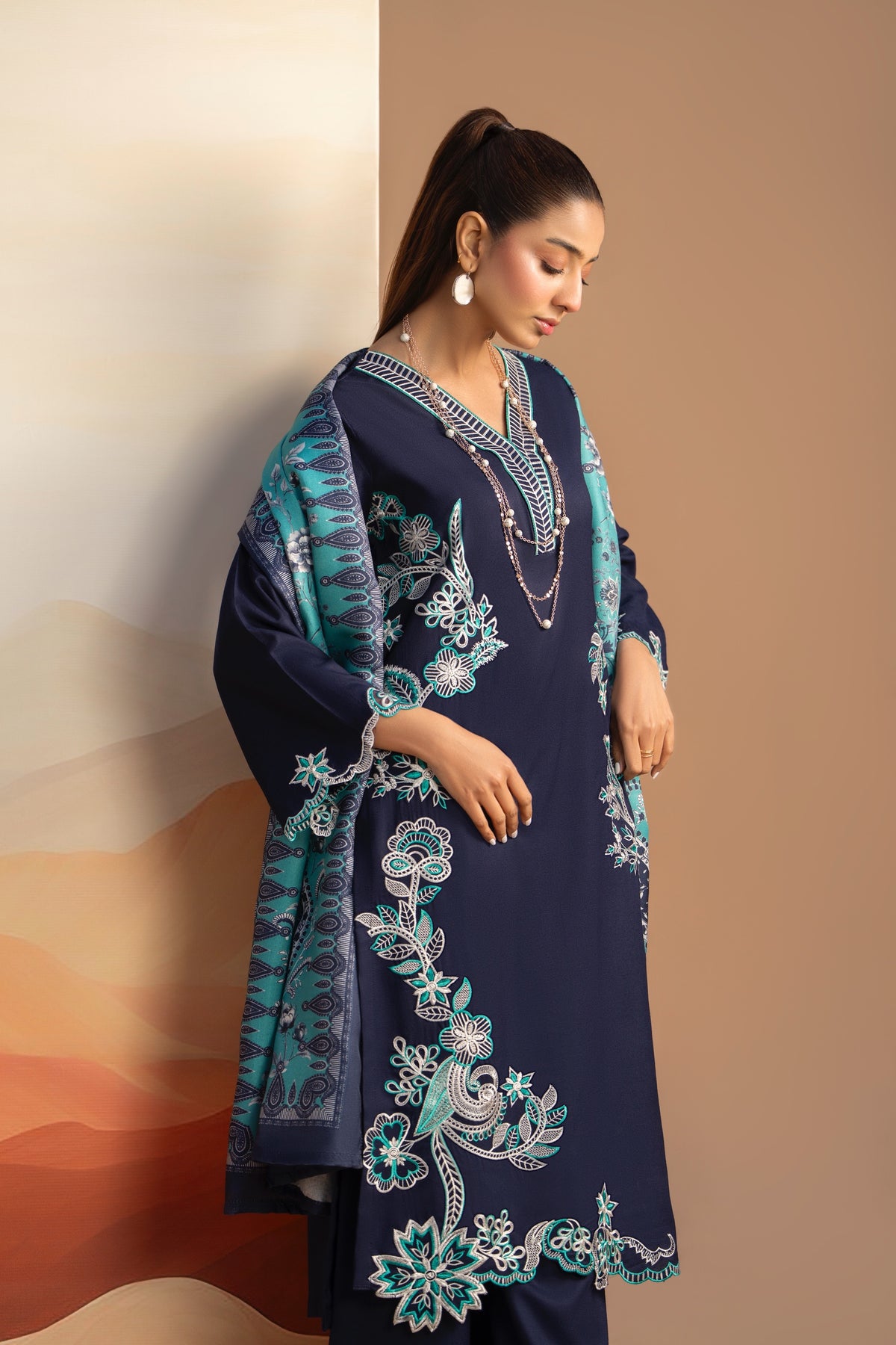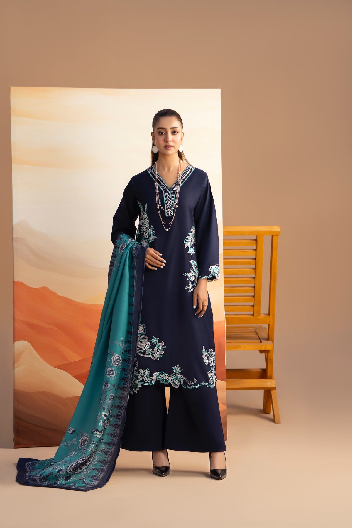 This deep navy-blue dhanak suit features a sophisticated V-neckline and intricate white-and-teal floral embroidery along the shirt and sleeves. It is paired with matching wide-leg trousers and a striking teal pashmina grip dupatta adorned with delicate floral patterns and dark borders.