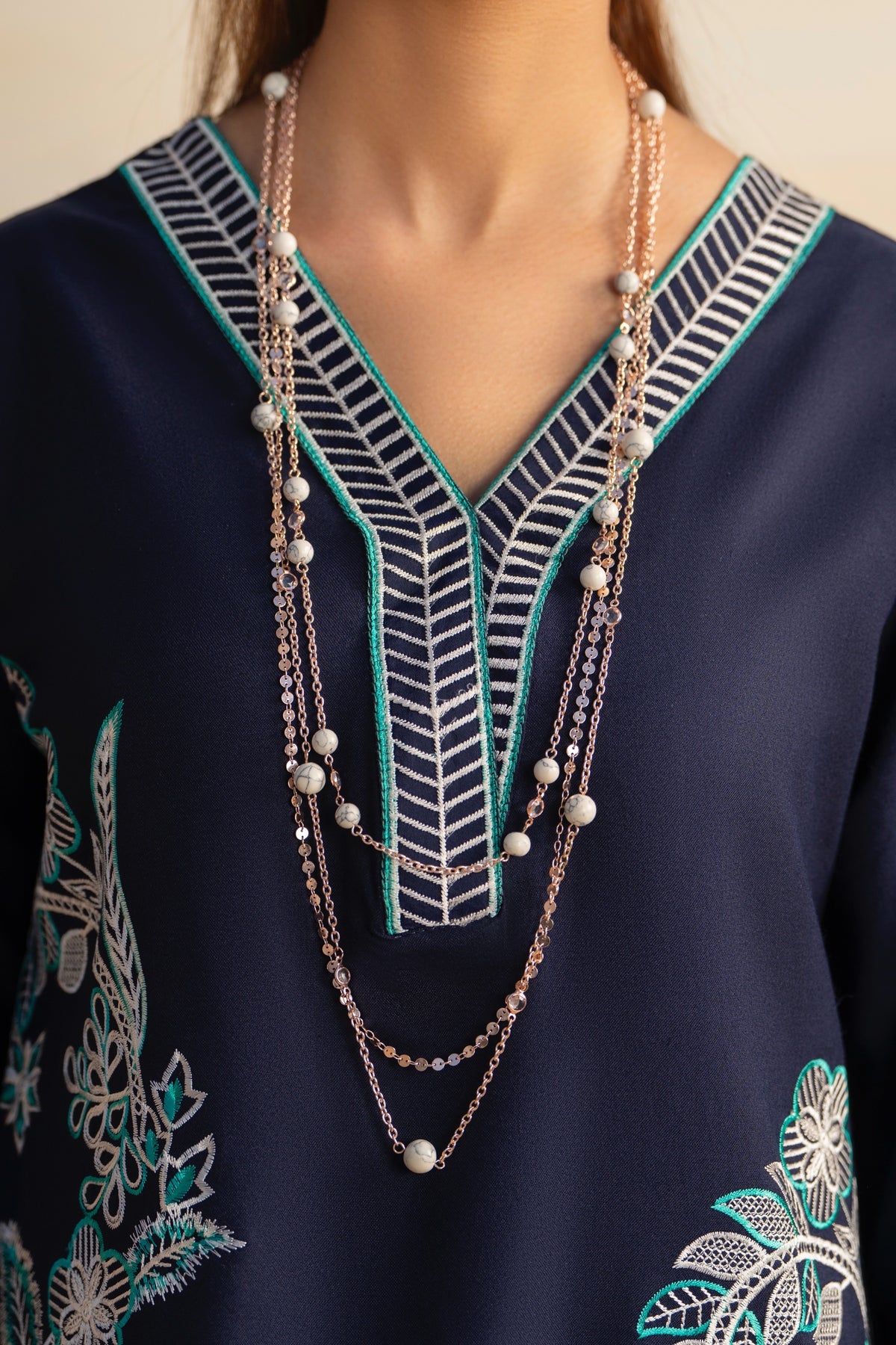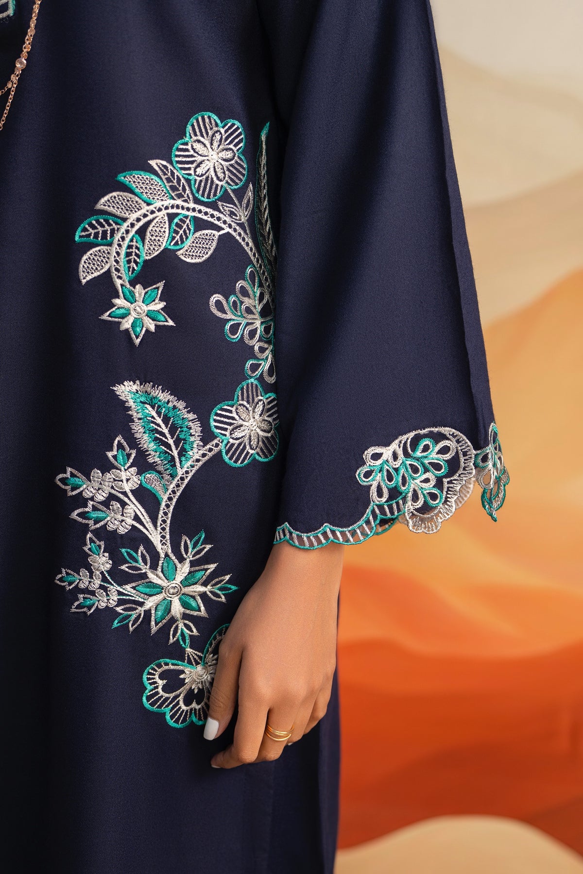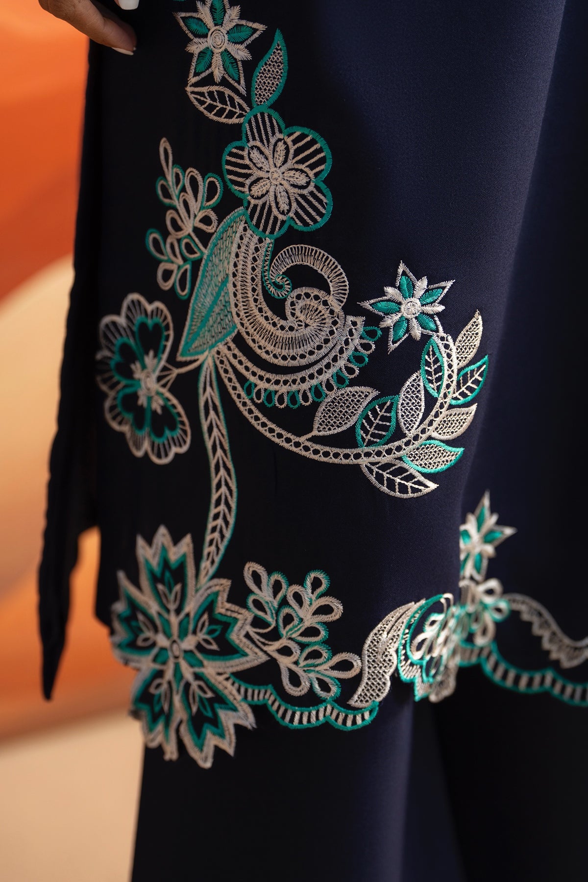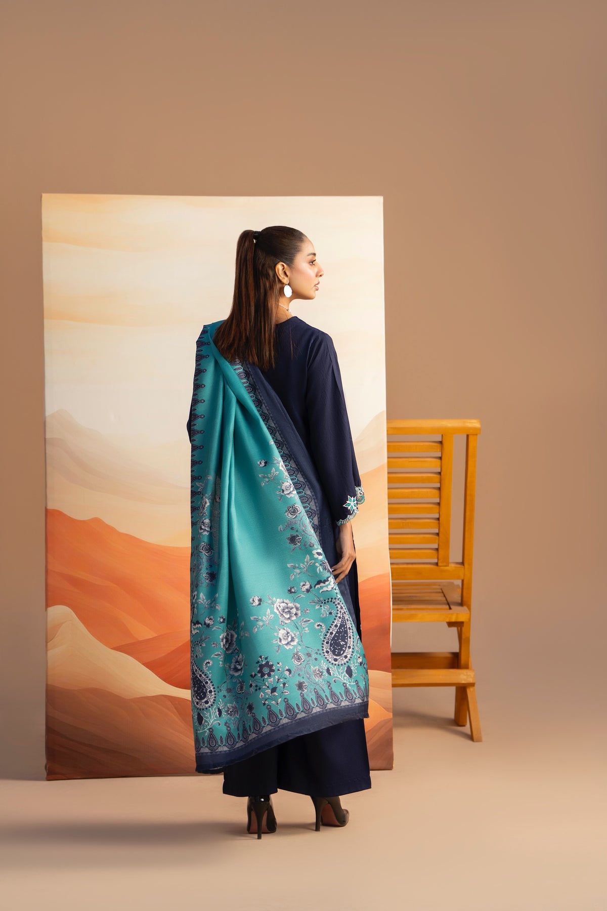 This deep navy-blue dhanak suit features a sophisticated V-neckline and intricate white-and-teal floral embroidery along the shirt and sleeves. It is paired with matching wide-leg trousers and a striking teal pashmina grip dupatta adorned with delicate floral patterns and dark borders.