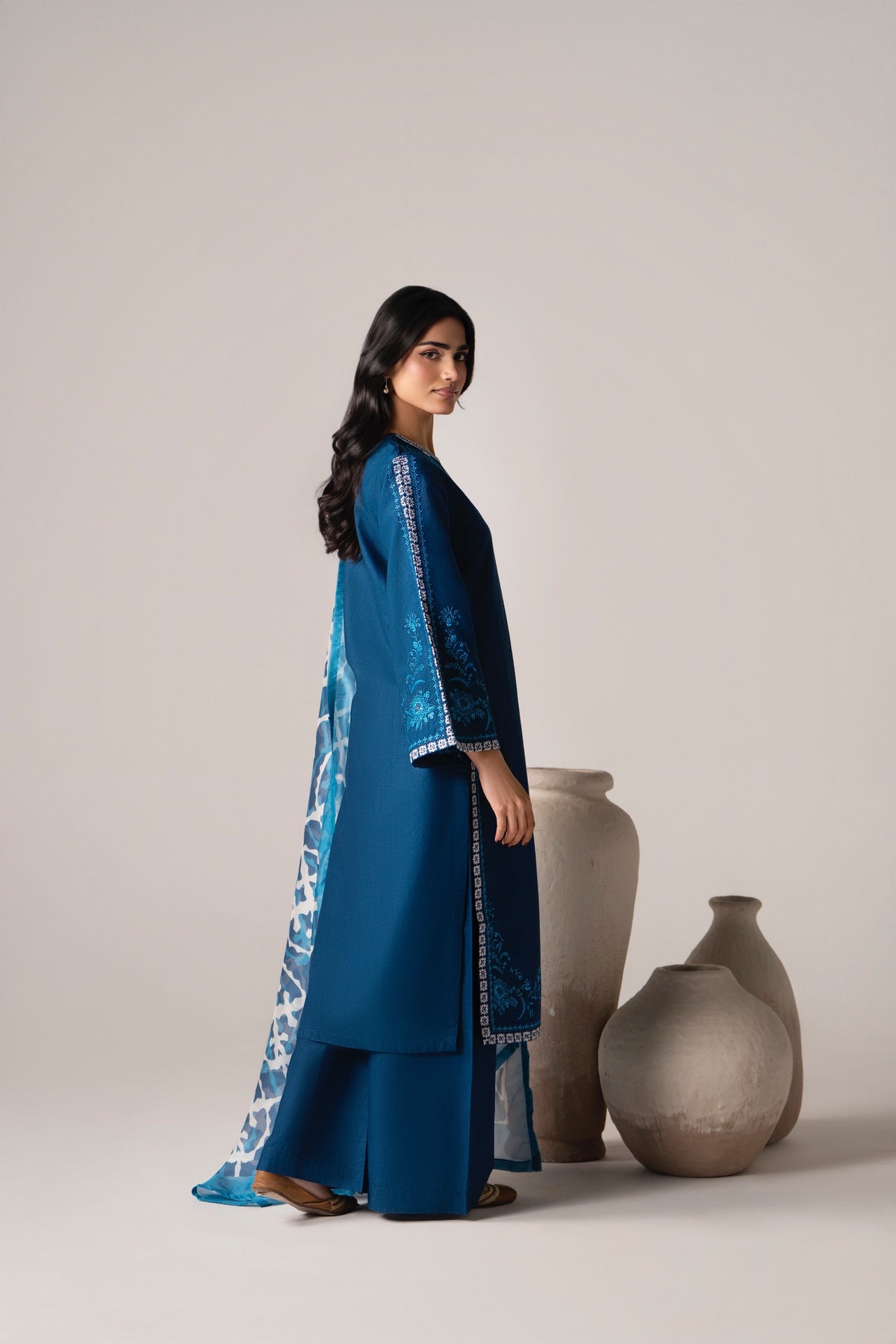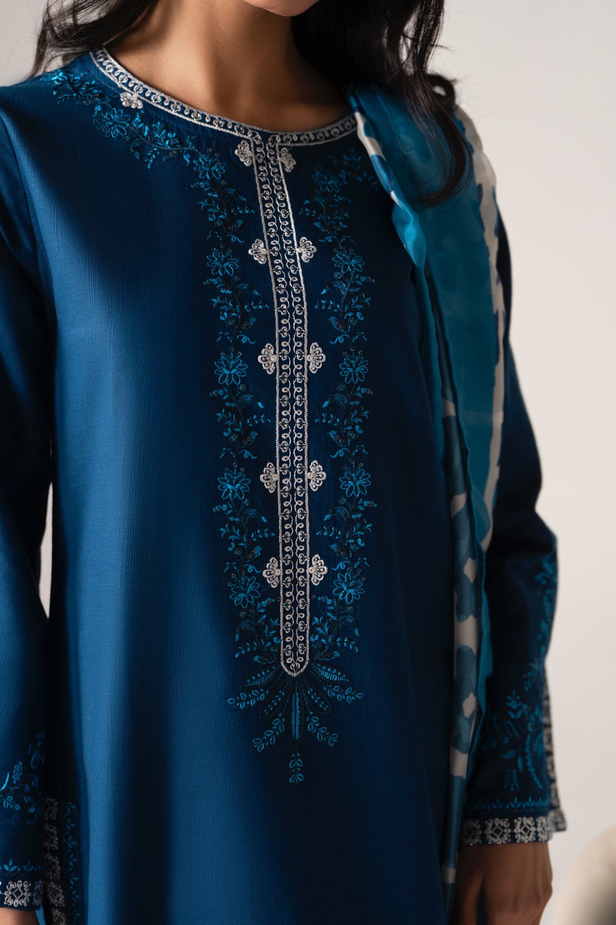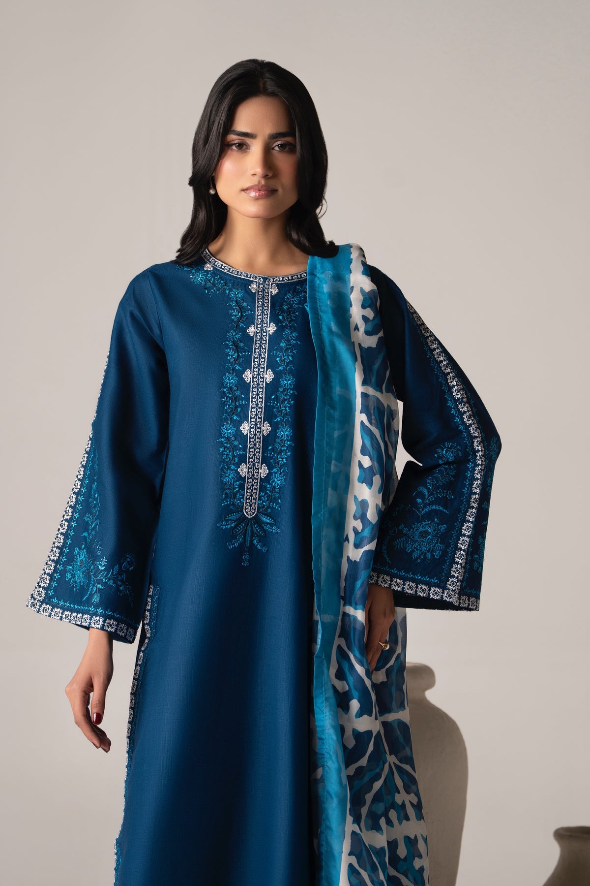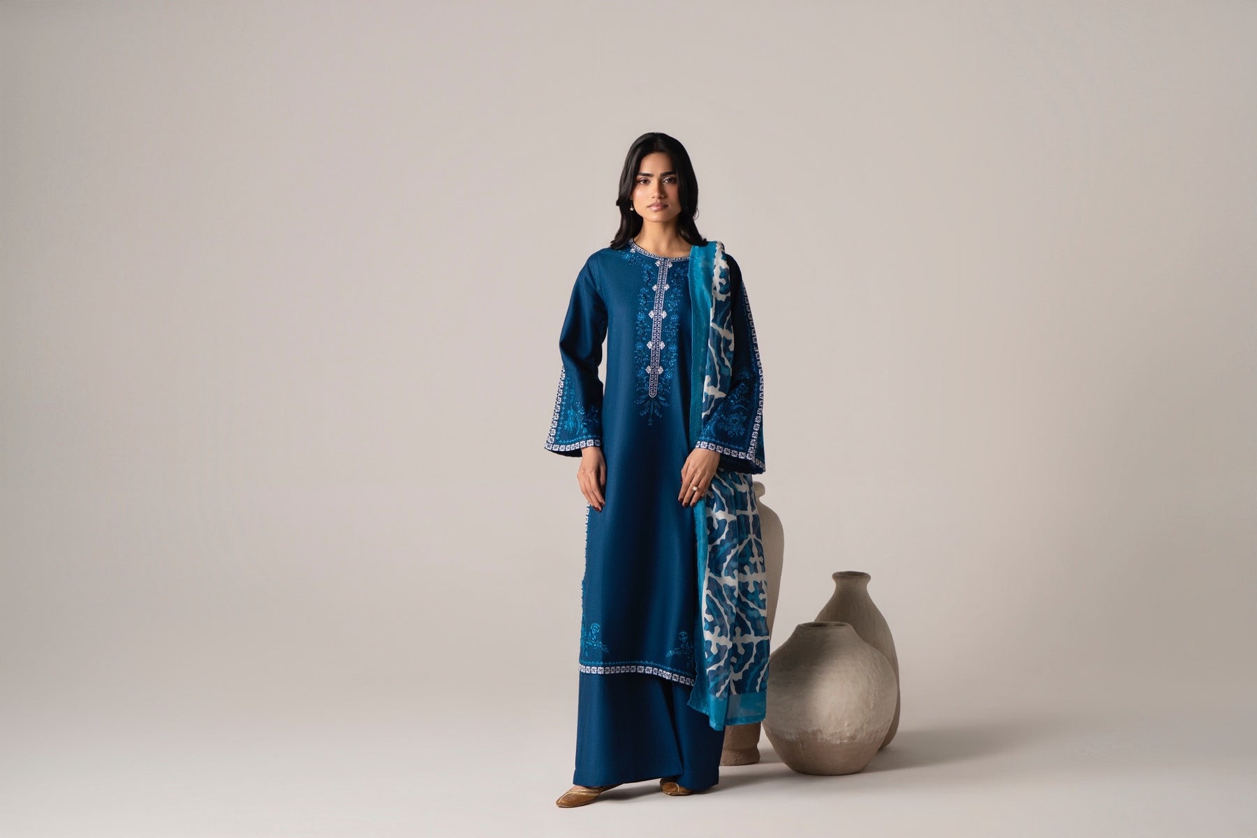 Sahil is a serene teal-blue khaddar suit designed for effortless winter styling. Minimal embroidery combined with a balanced color palette creates a clean and elegant look. Finished with a printed dupatta, this outfit is ideal for both daytime wear and casual evenings.