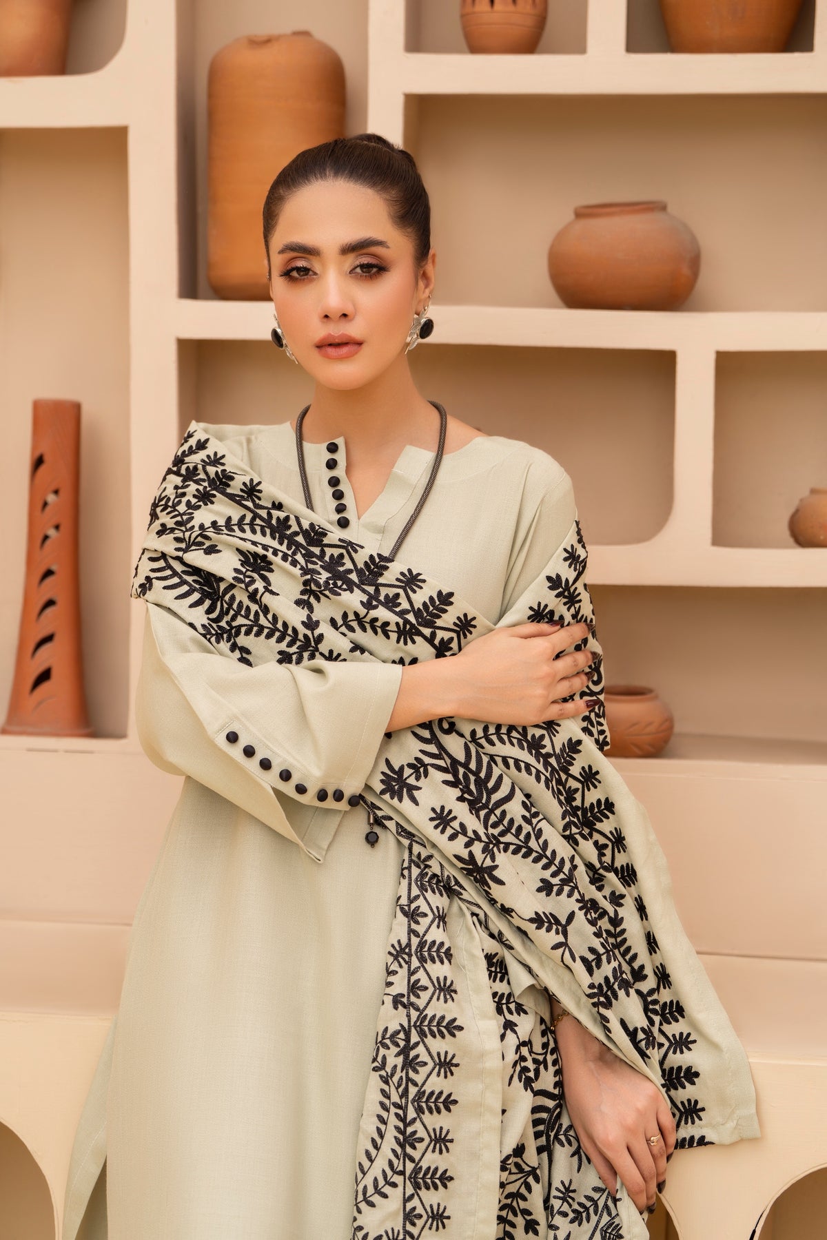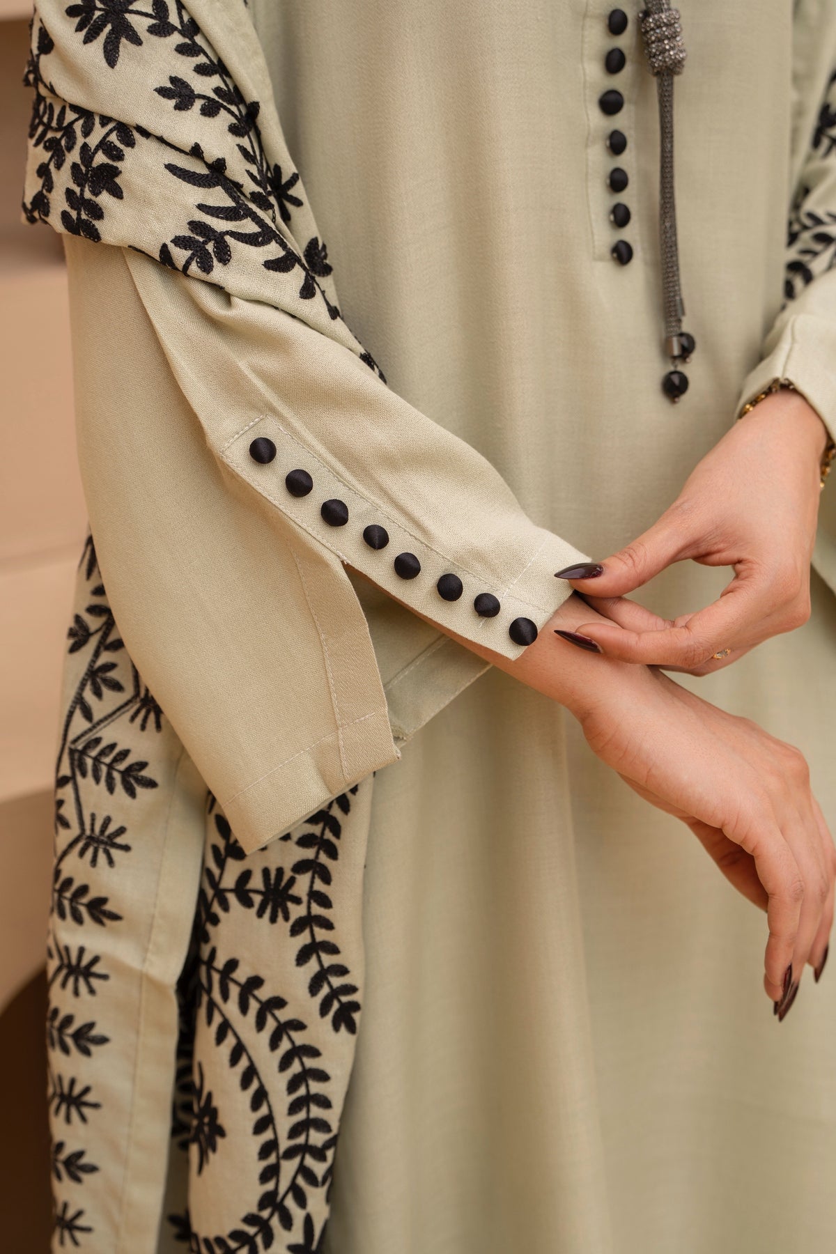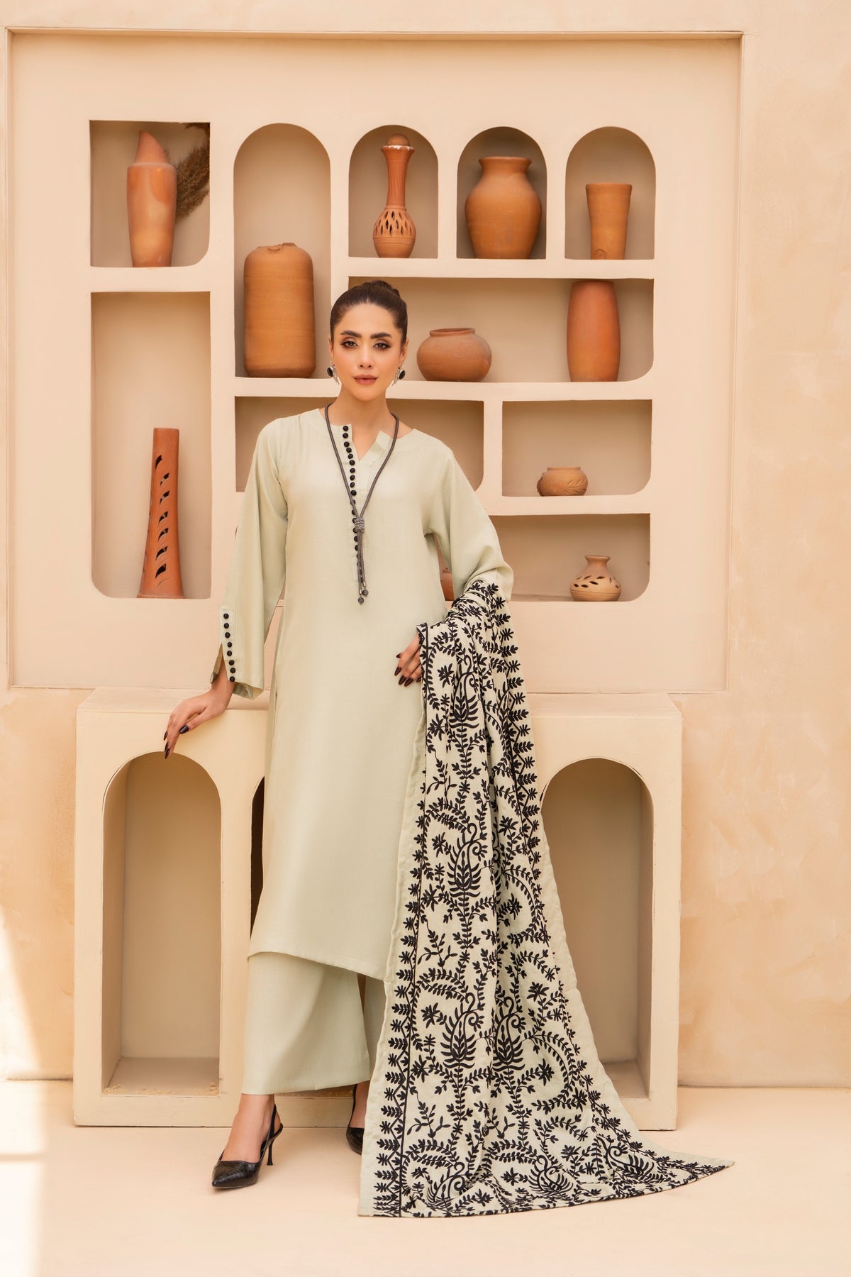 A serene Dhanak suit in a light sage shade, designed with clean cuts and minimal elegance. Paired with a richly embroidered wool shawl, featuring bold black threadwork, a perfect blend of subtlety and statement.