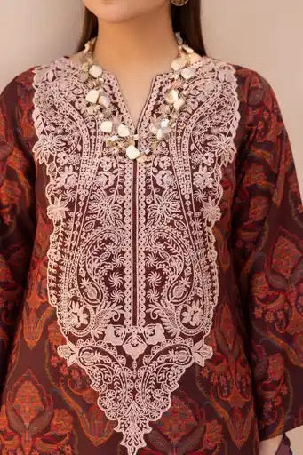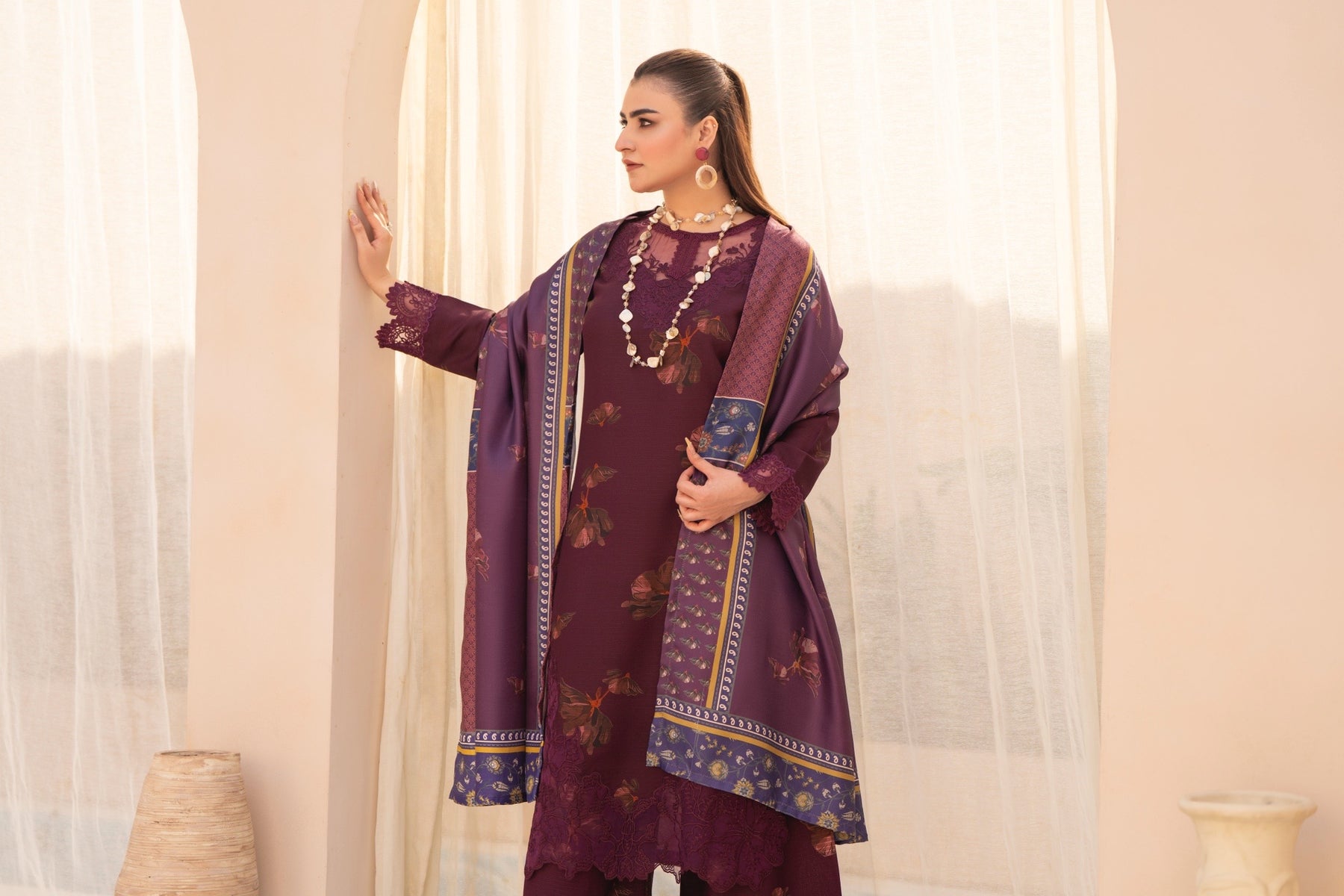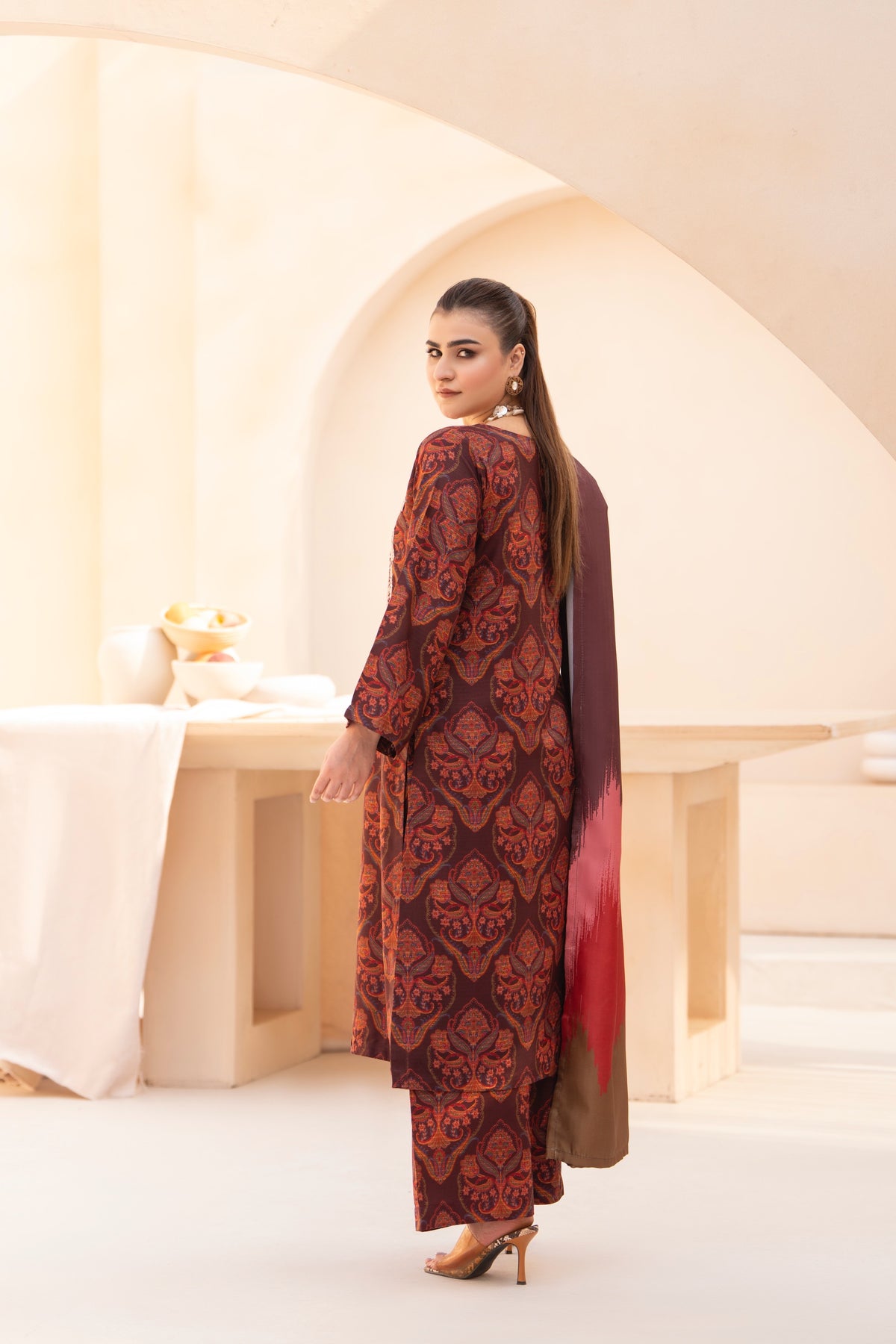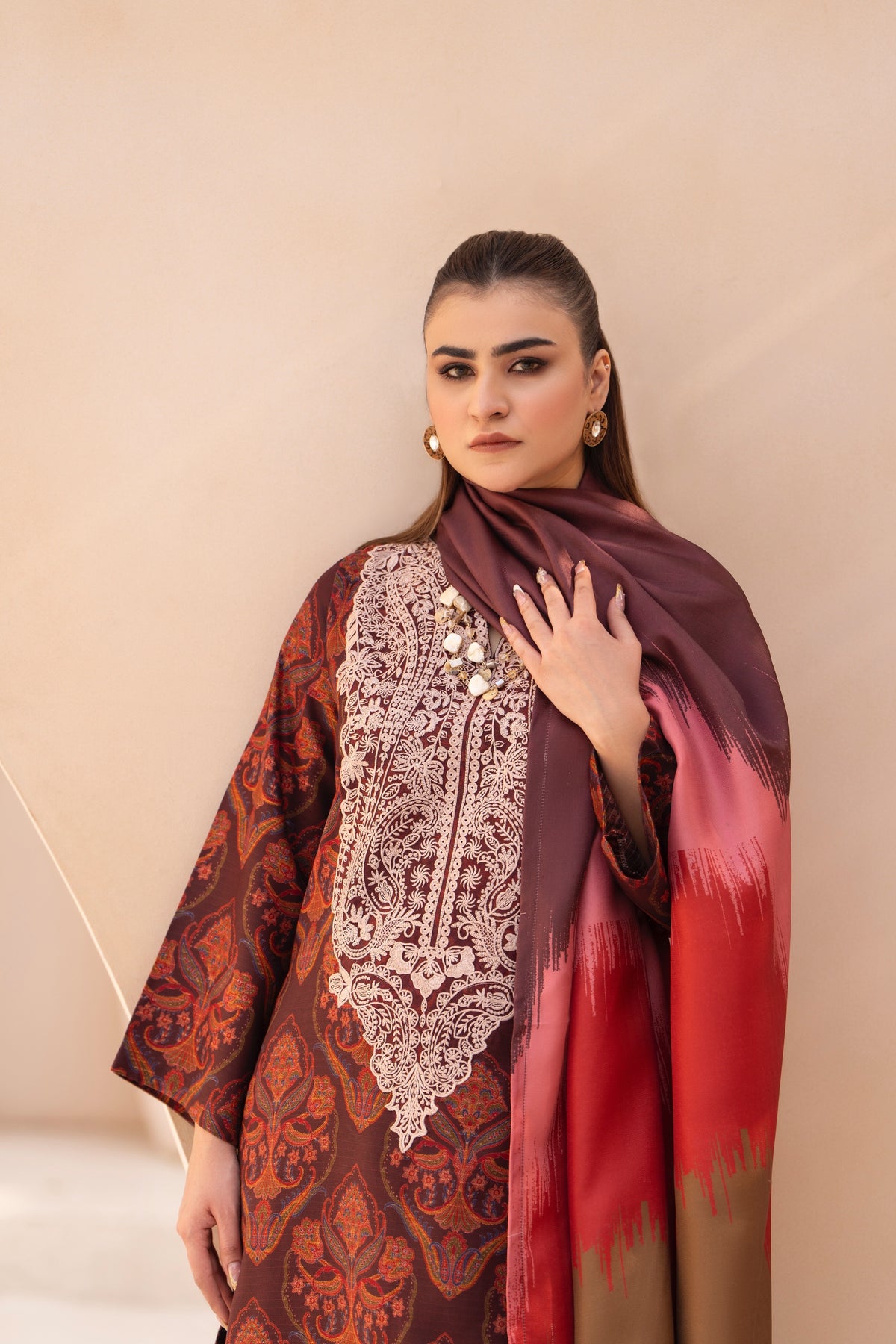 Earthy sienna hues with intricate thread embroidery for a warm, classic winter aesthetic. The soft gradient wool shawl adds a luxurious flow to the entire ensemble.