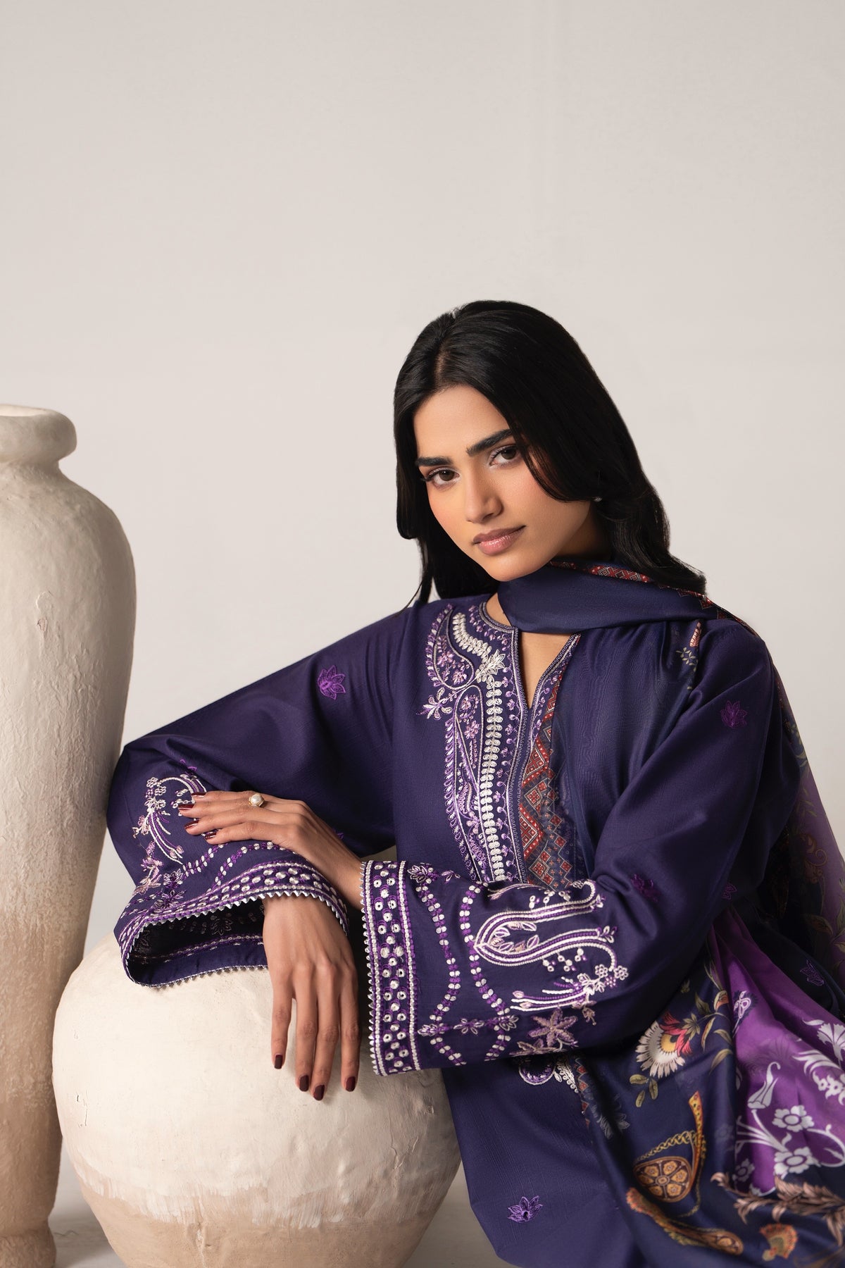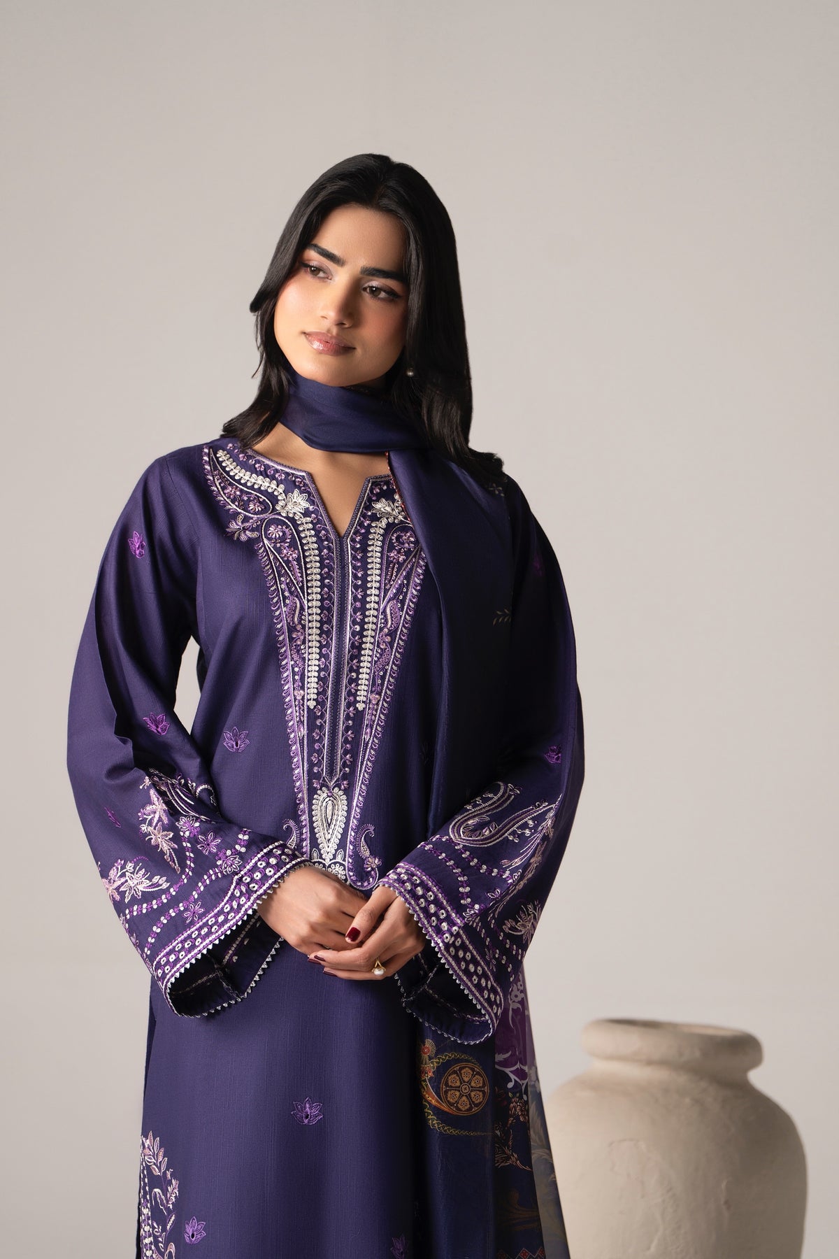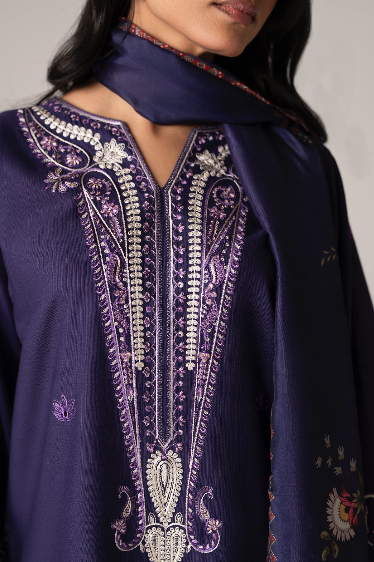 Description: Neelam is a deep purple khaddar outfit that reflects quiet luxury and sophistication. The finely embroidered neckline and sleeve detailing add a refined touch, while the soft khaddar fabric ensures comfort throughout the season. A perfect choice for graceful winter wear.