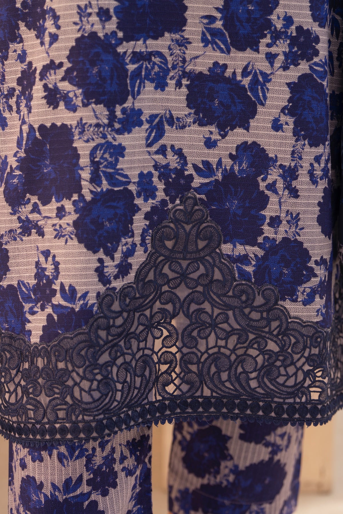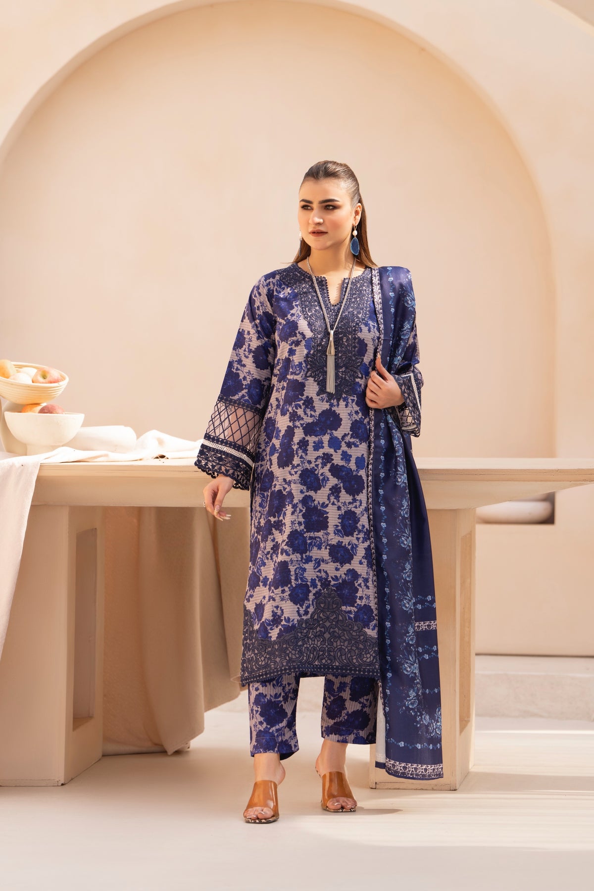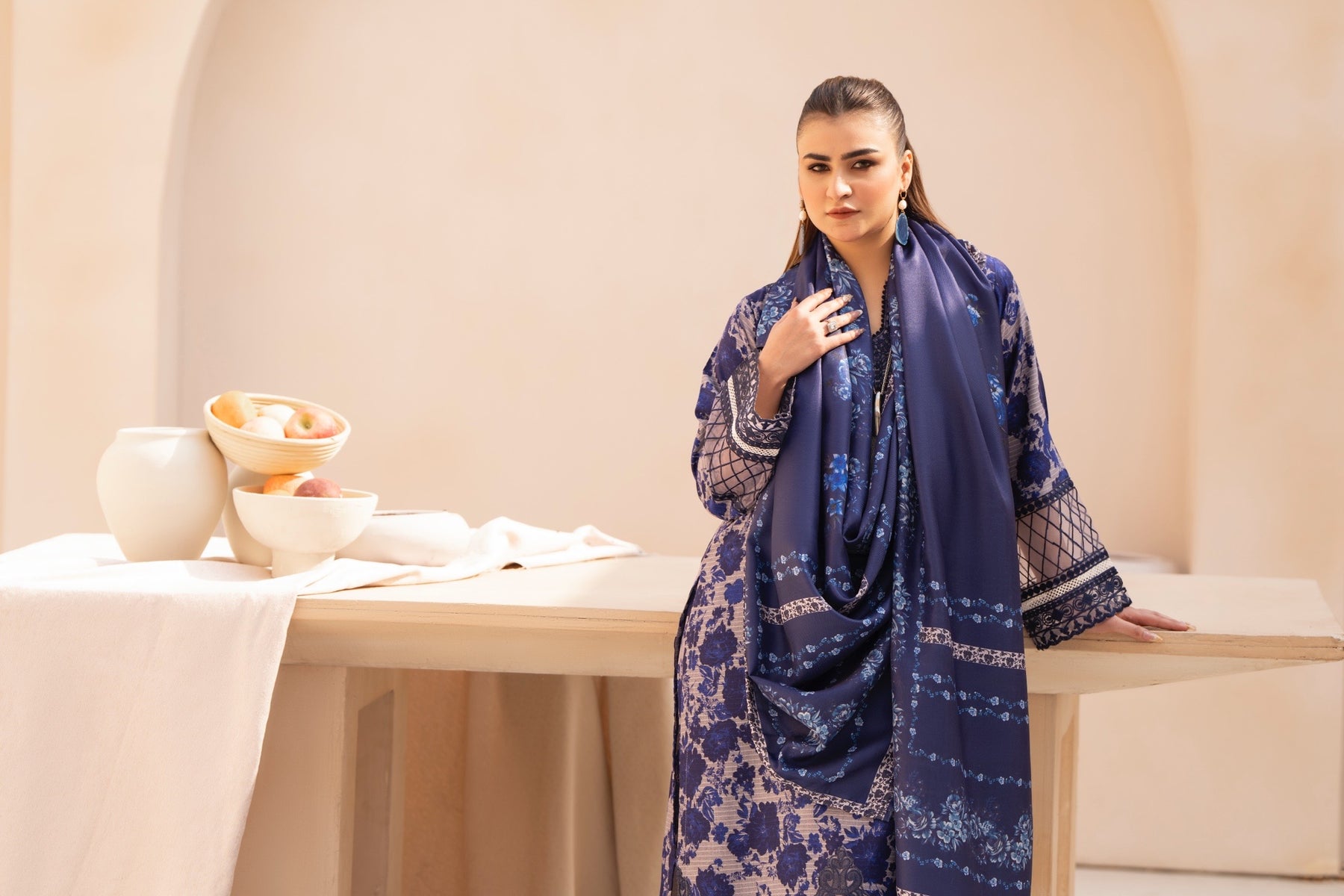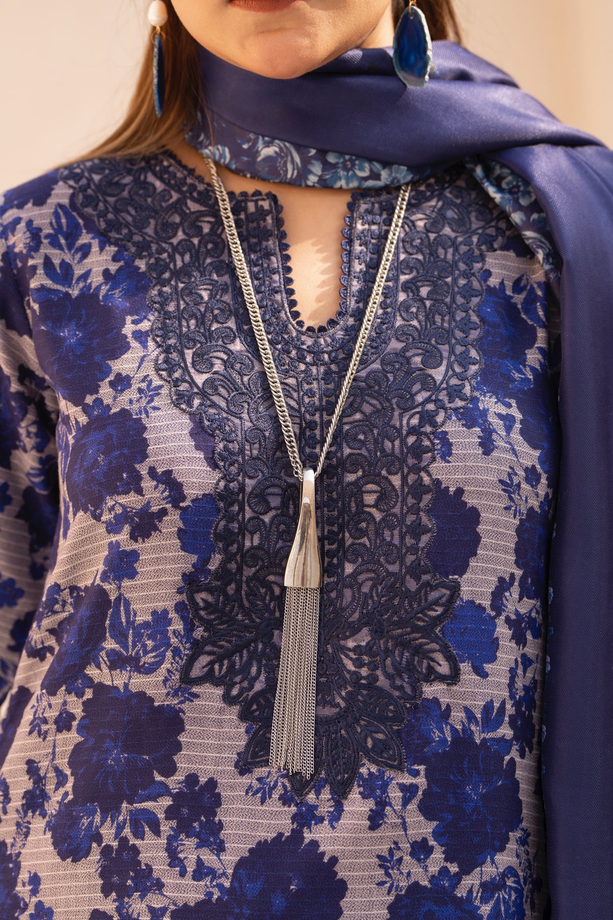 A sapphire-blue outfit featuring detailed patterned sleeves and subtle embroidered accents. Paired with a coordinating wool shawl for a polished, refined winter look.