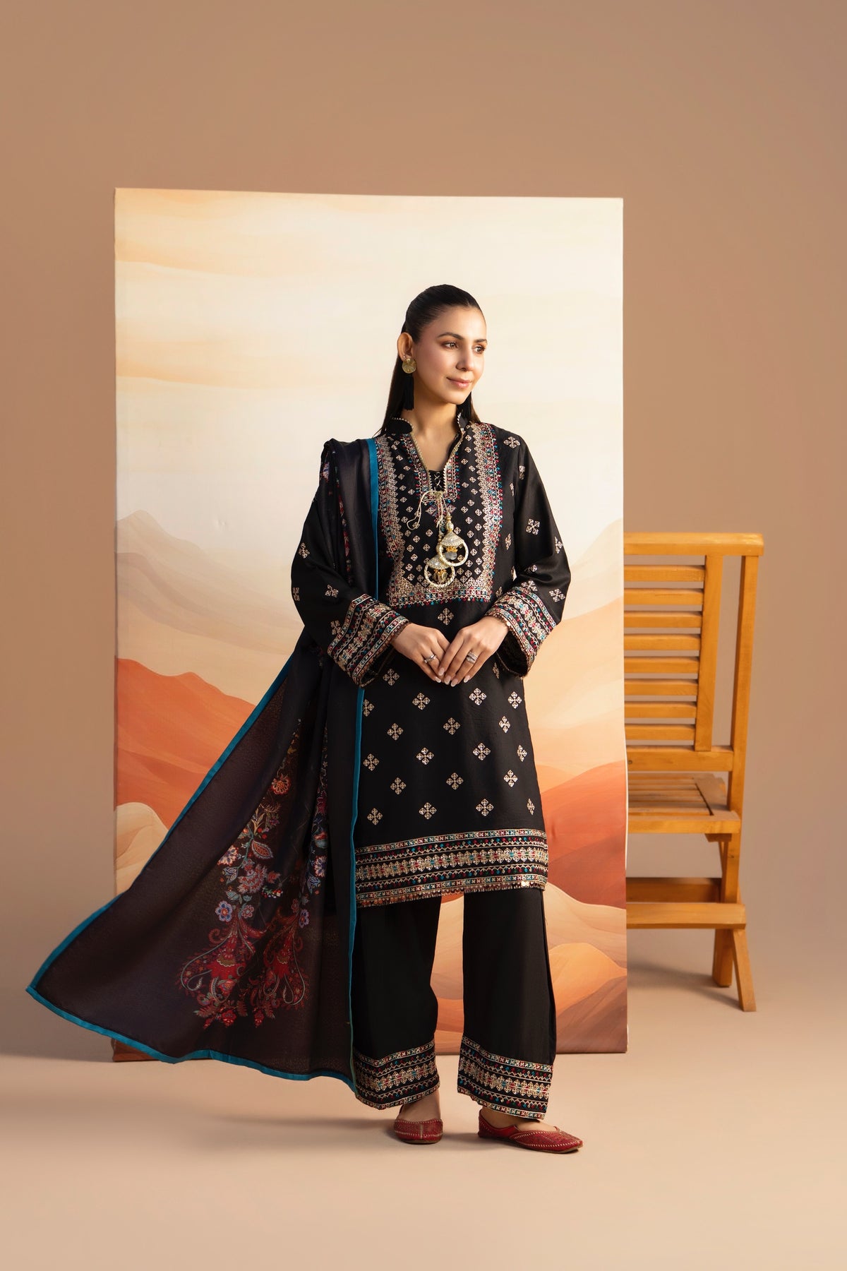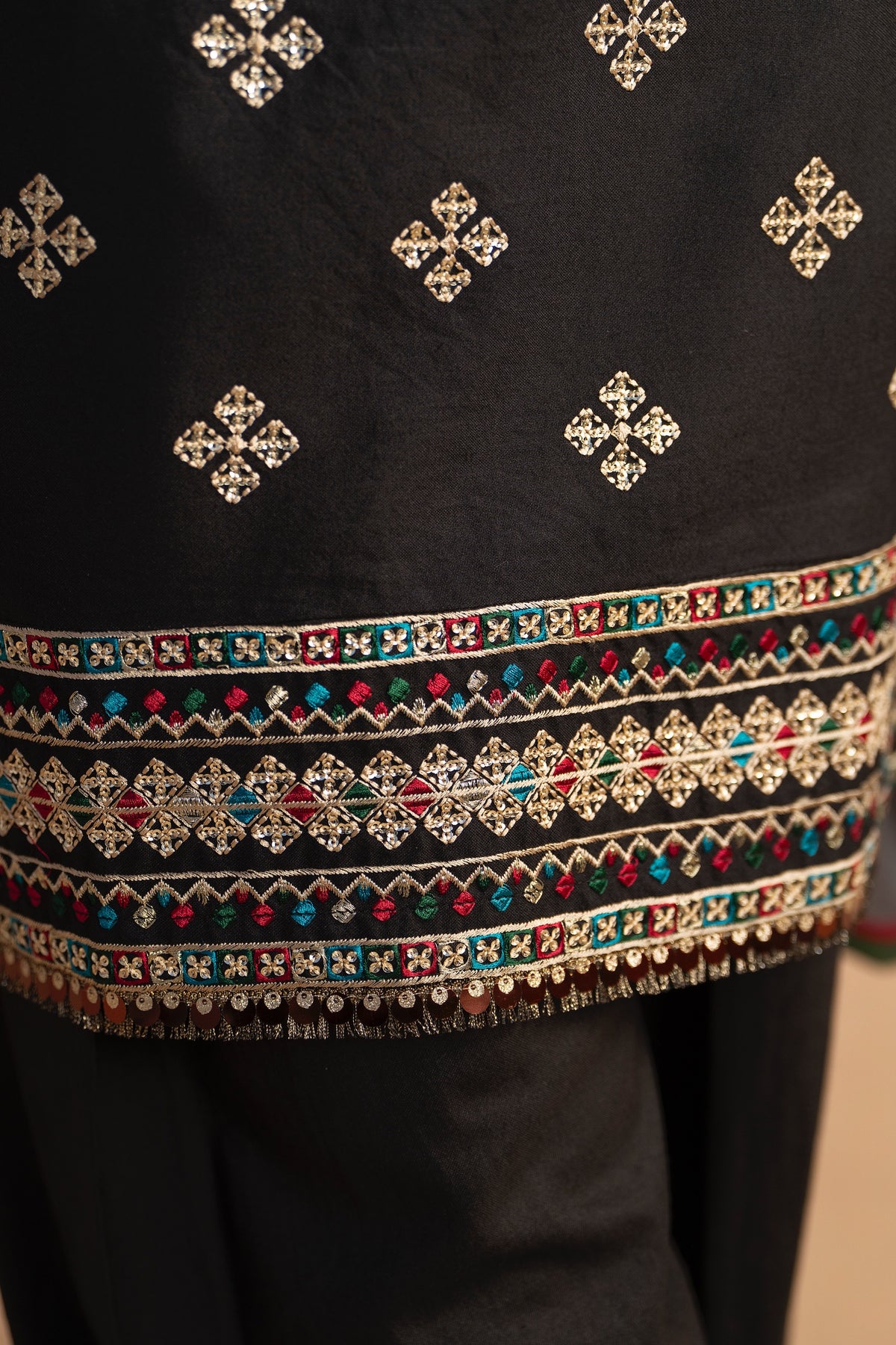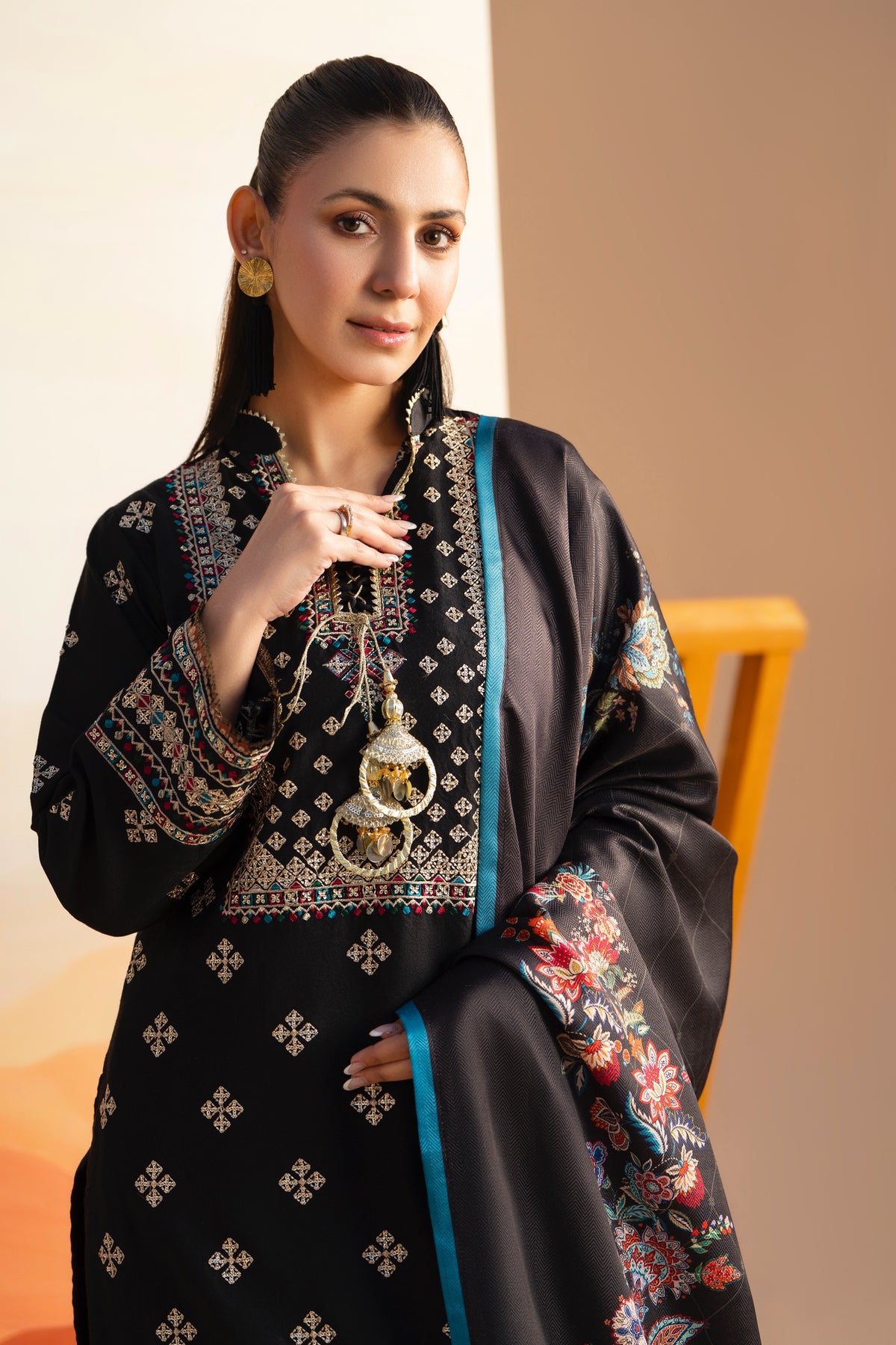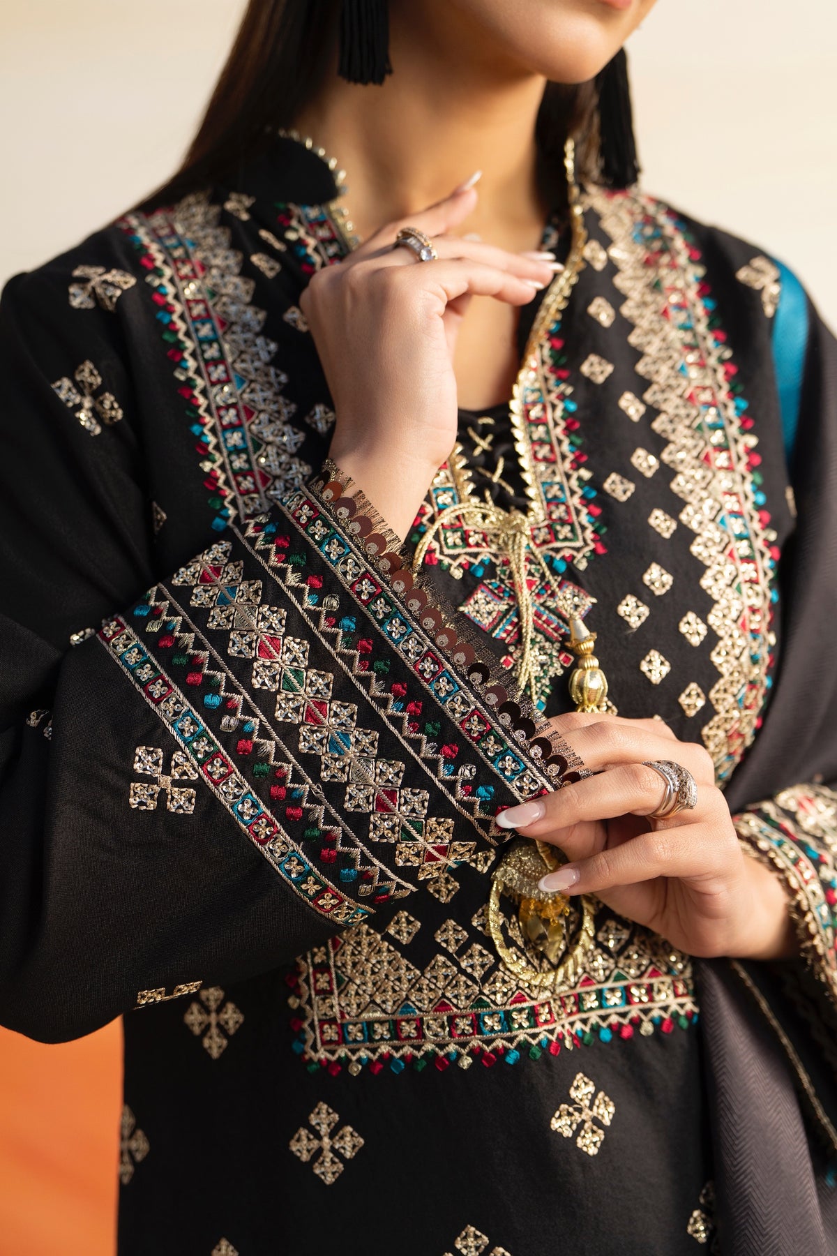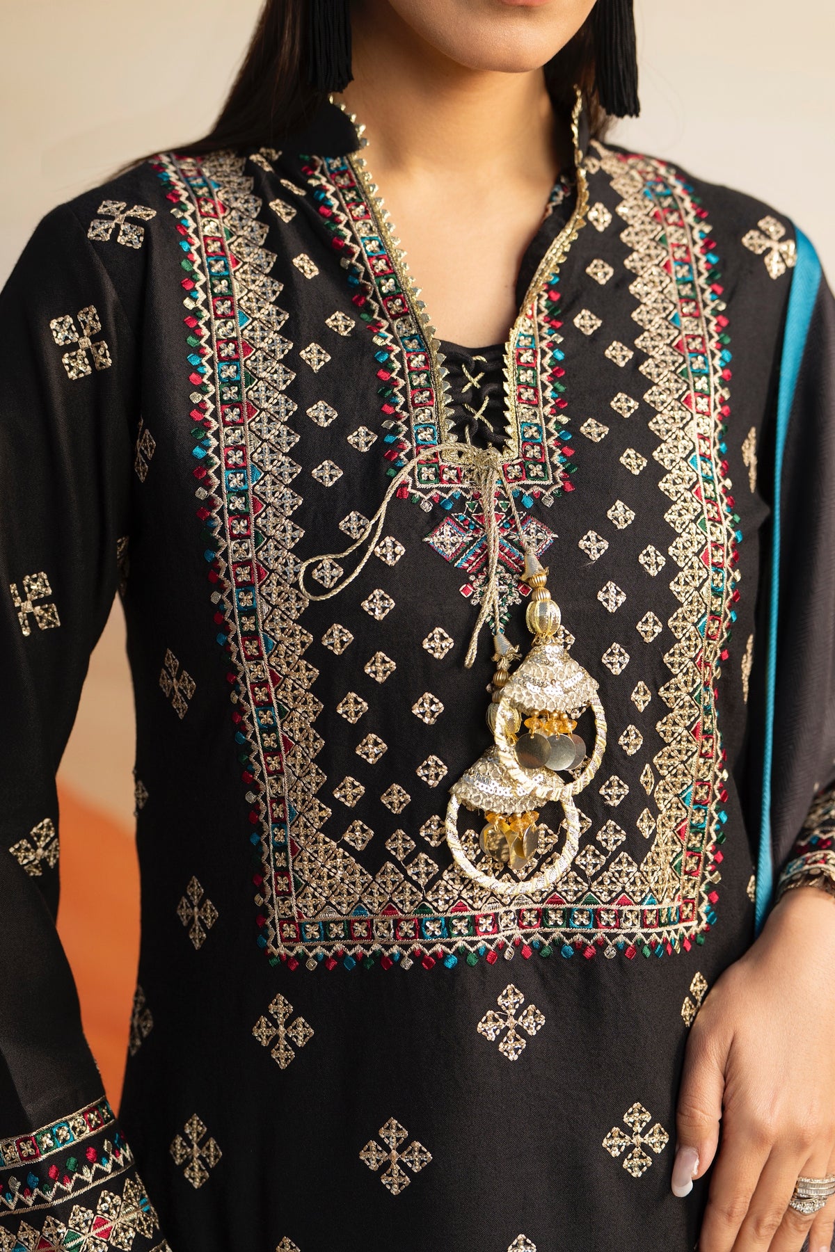 This elegant black dhanak suit features a geometric-embroidered kameez with traditional tassels and matching shalwar. The look is elevated by a luxurious pashmina grip dupatta, finished with a vibrant turquoise trim and a rich floral pallu.