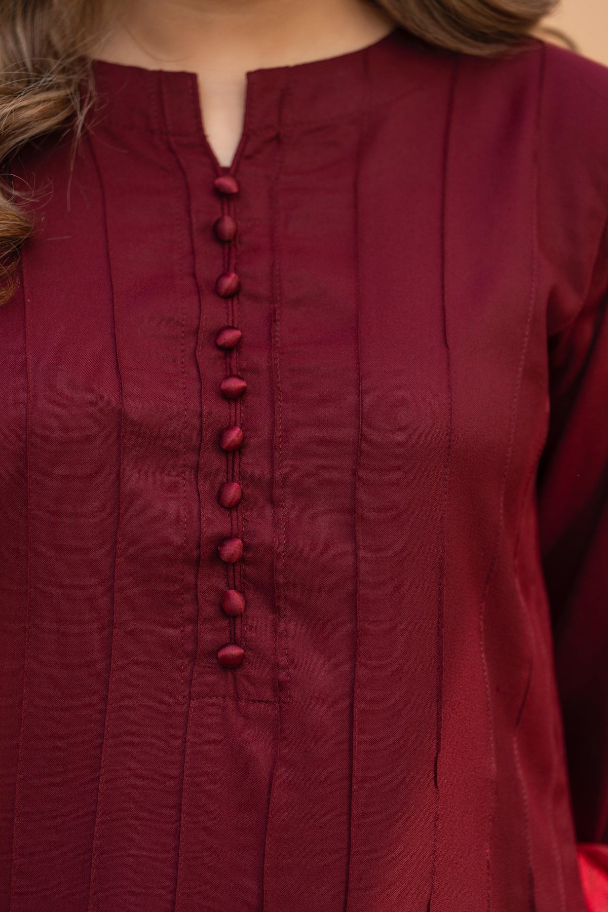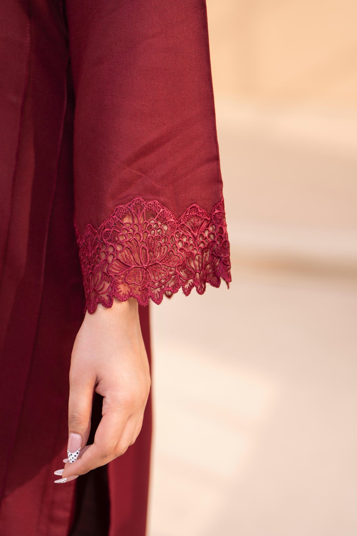 A rich deep maroon dhanak suit featuring delicate lace details and fine button work, paired with a beautifully printed warm shawl in noir tones with floral accents.