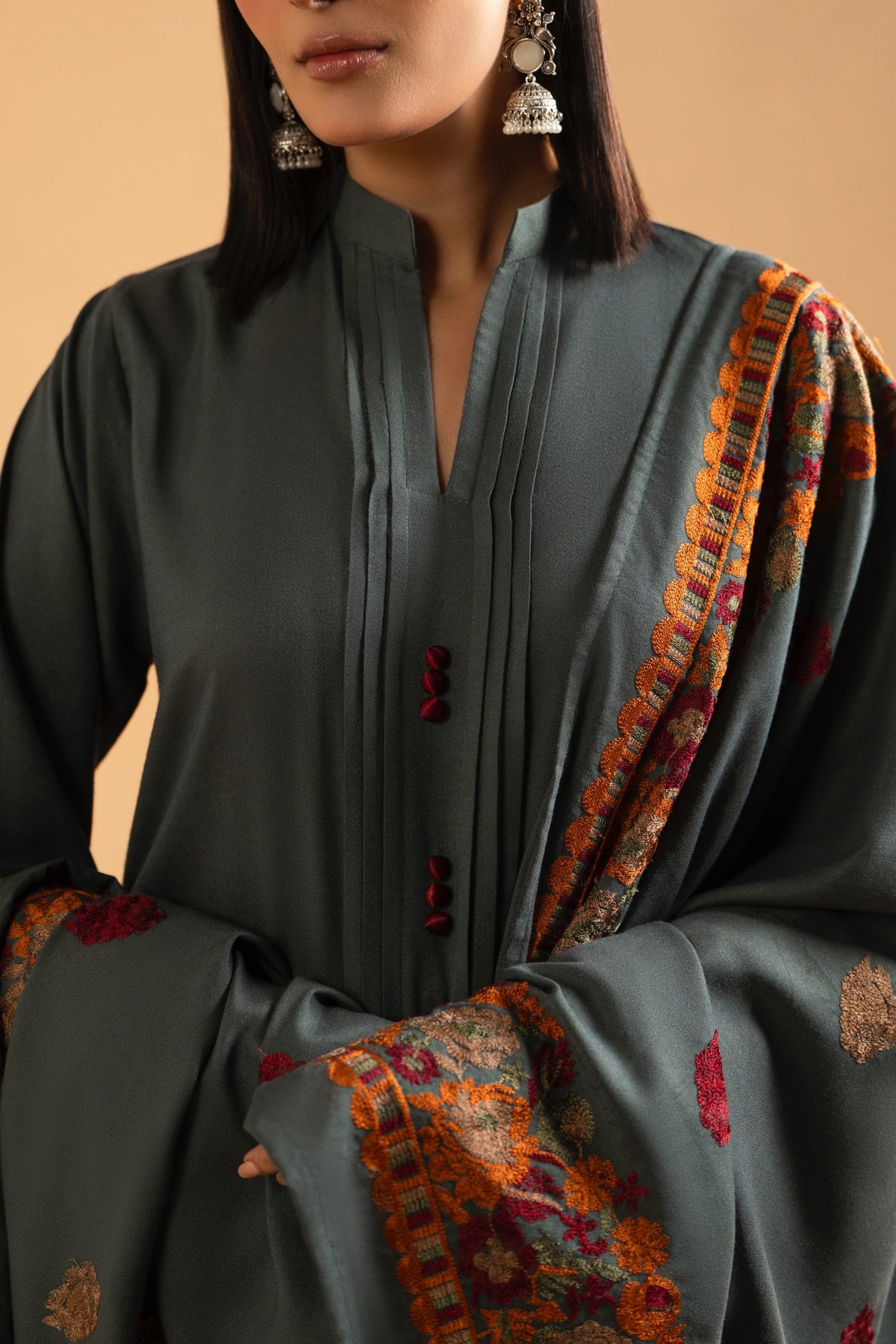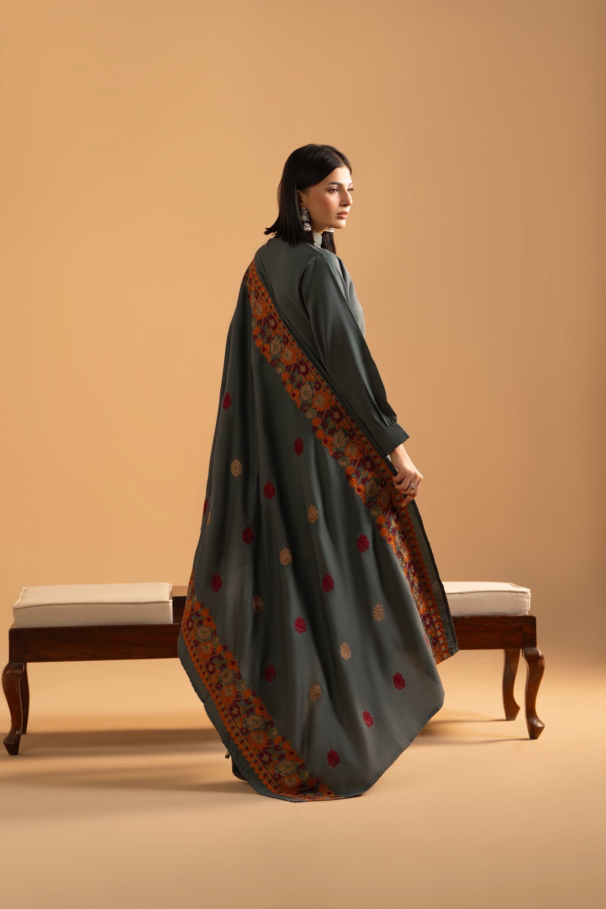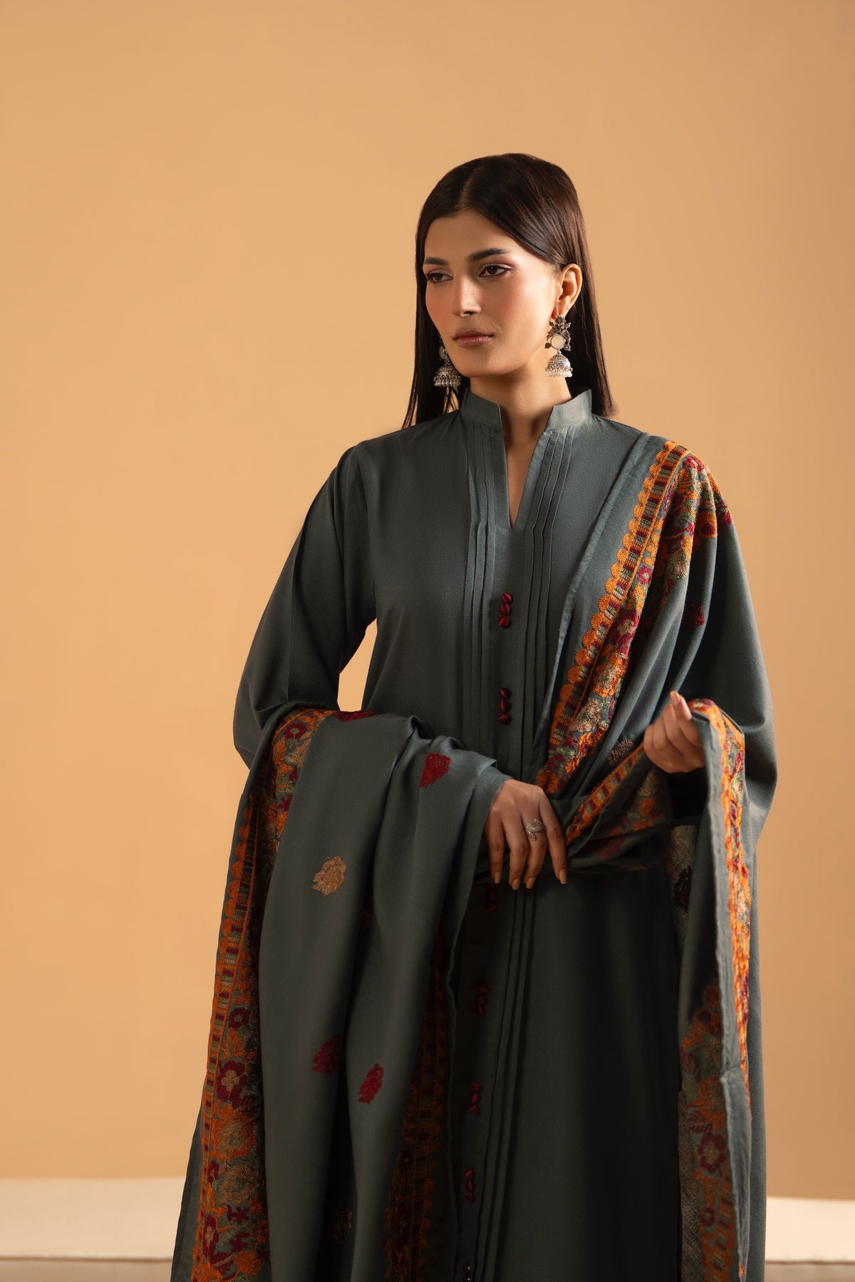 A statement winter ensemble crafted in deep emerald-grey Dhanak, paired with a richly embroidered shawl featuring vibrant rust, maroon and antique gold florals. EmeraldRust blends tradition with modern minimalism, making it the perfect choice for winter dinners, festive gatherings and elegant daywear.