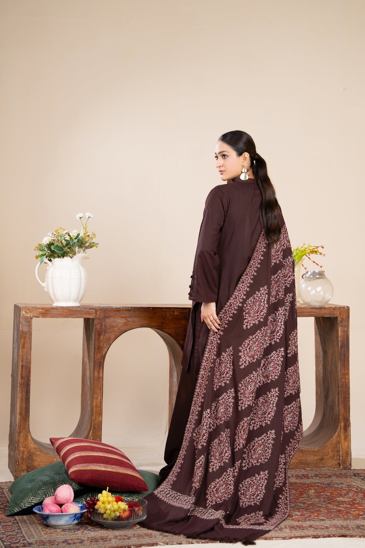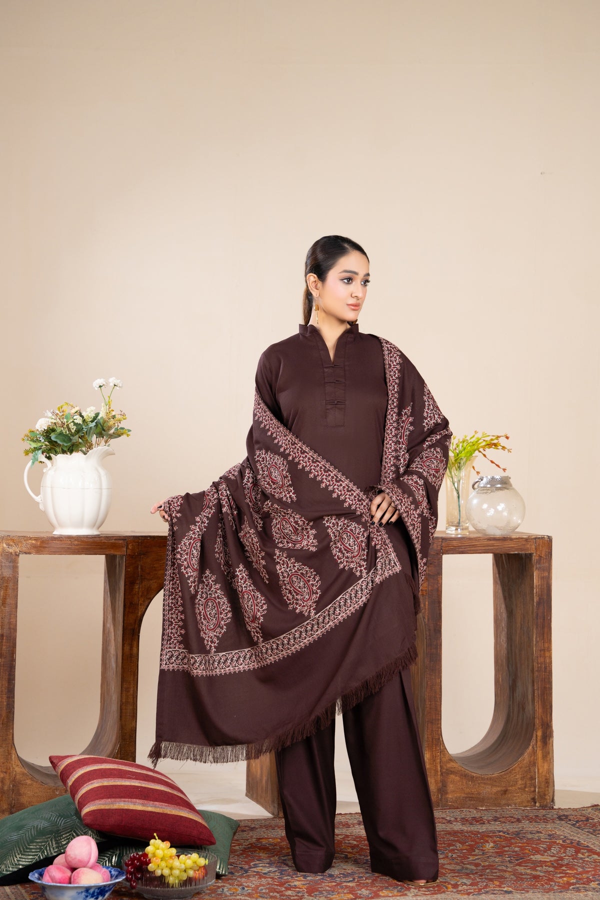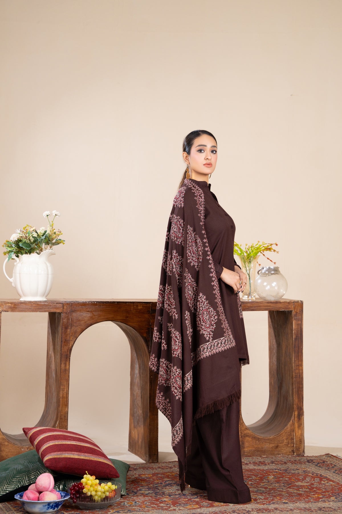 A rich dhanak shirt and trouser set in deep chocolate brown, paired with a dhanak shawl adorned with intricate paisley embroidery. The earthy tone radiates warmth and elegance, while the detailed shawl adds a touch of heritage charm. A timeless winter outfit that balances tradition with sophistication.