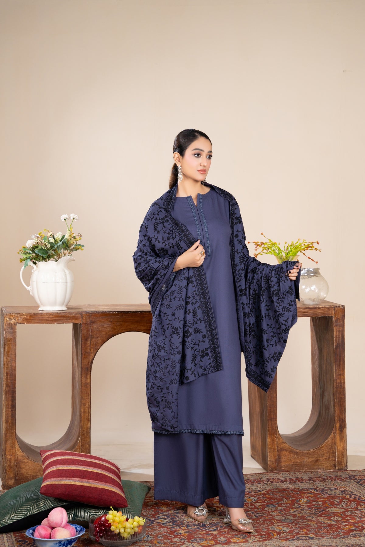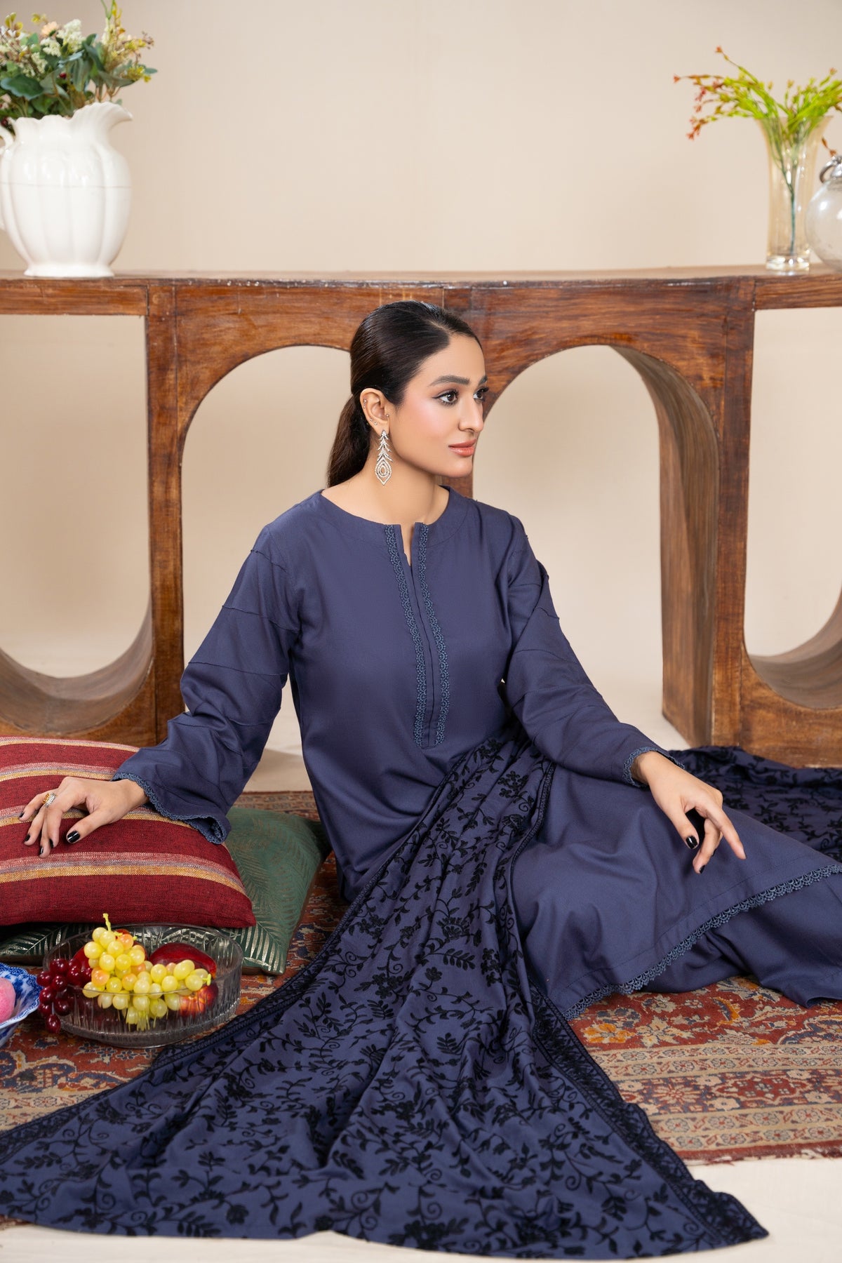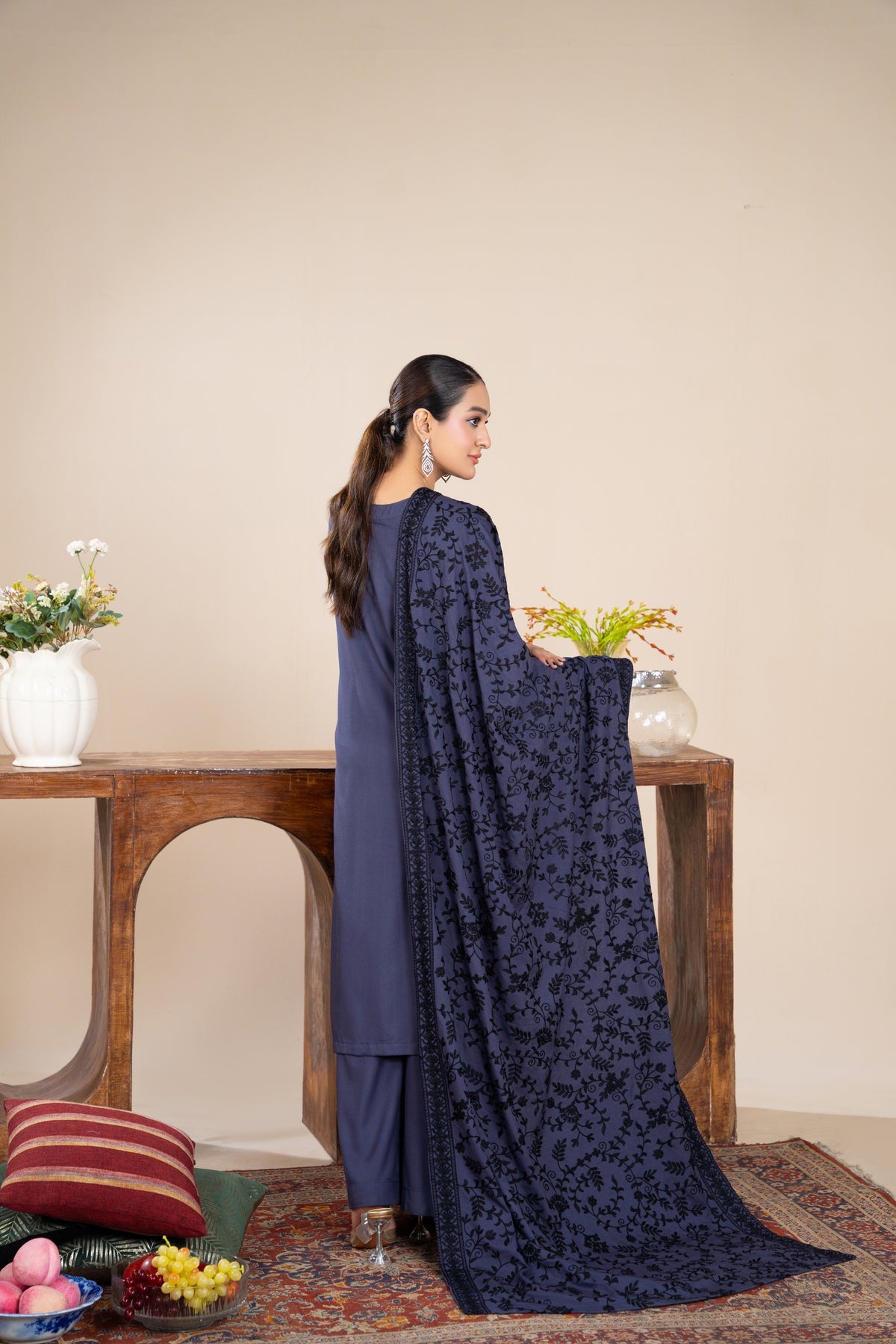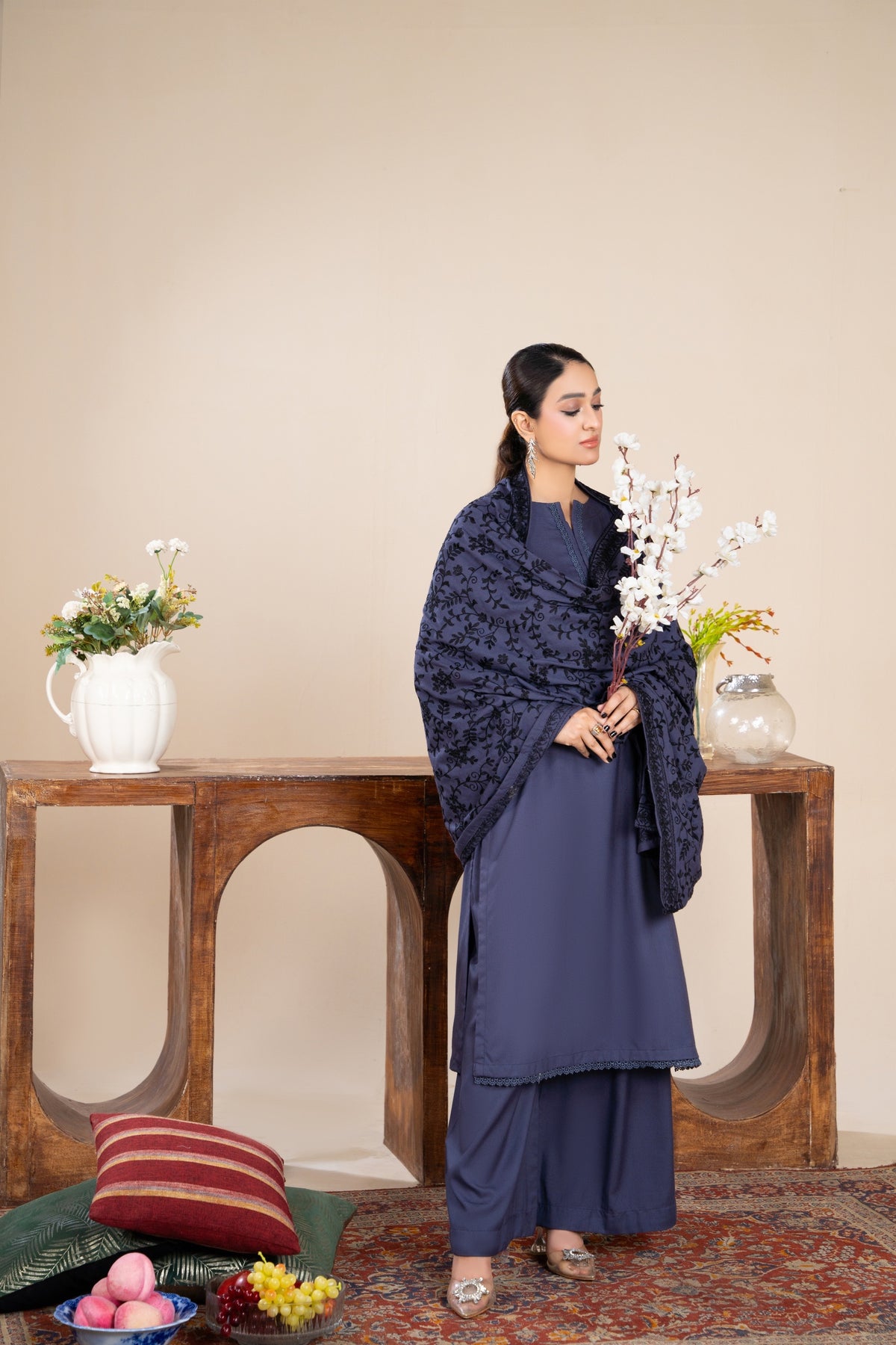 Adding charm to this outfit is the embroidered dhanak shawl, adorned with intricate floral patterns, making it a perfect pick for cozy evenings and festive gatherings.