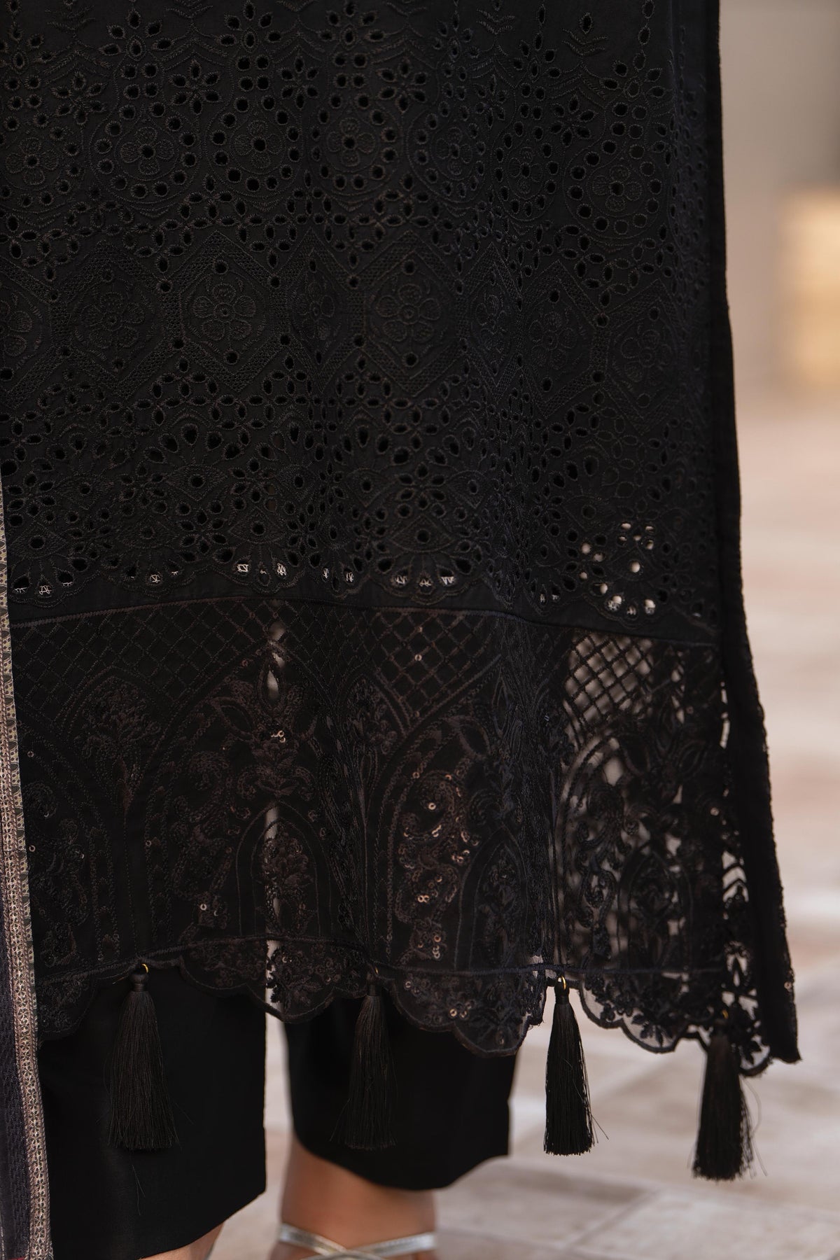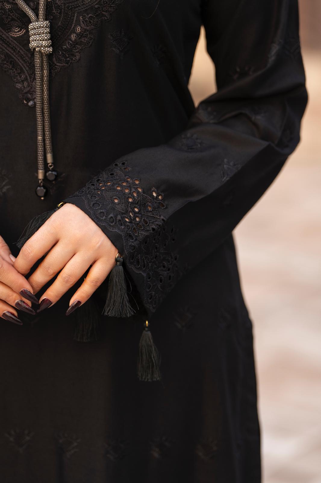 Step into timeless elegance with this beautifully crafted black ensemble, designed for effortless sophistication. The shirt features intricate tonal embroidery on the neckline and hem, finished with delicate cutwork detailing that adds depth and refinement. Subtle tassel accents on the sleeves enhance its graceful charm.