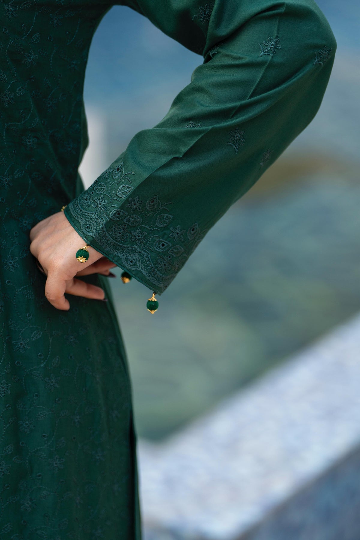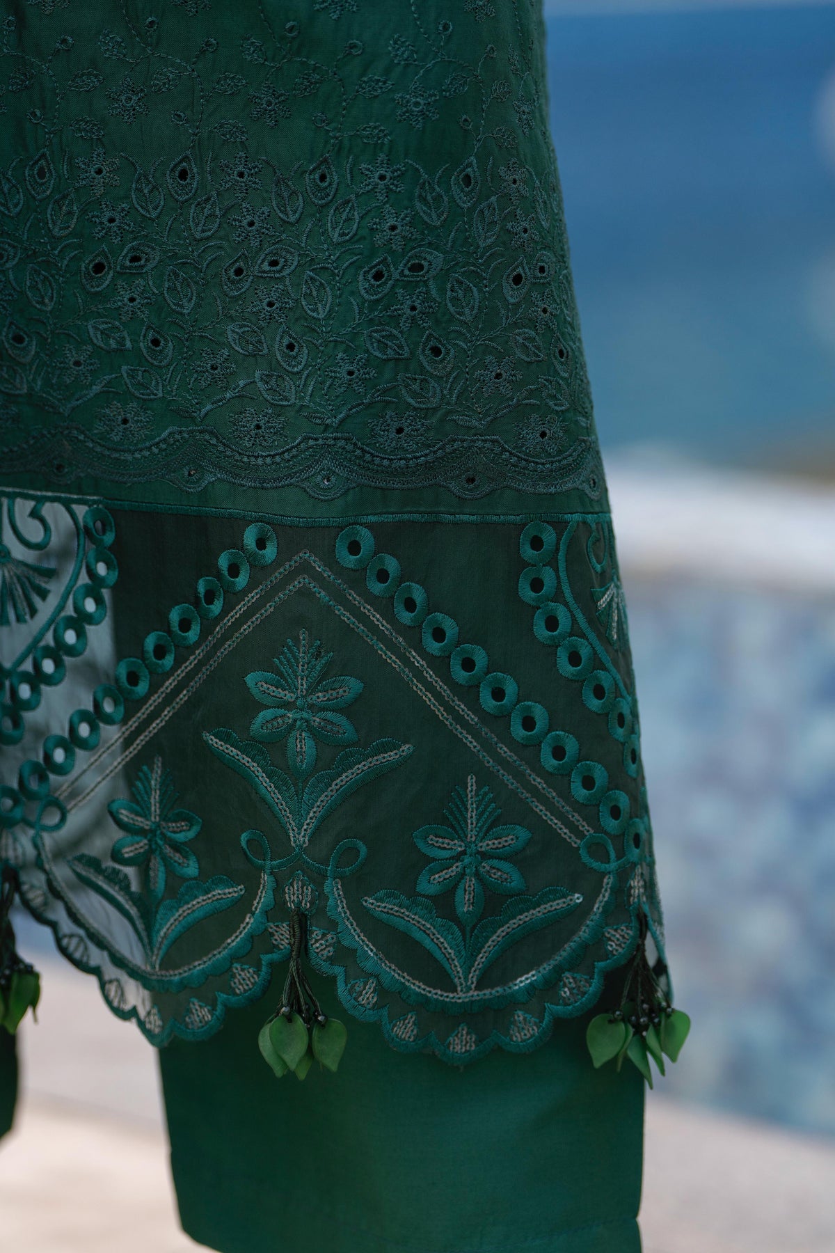 and intricate cutwork detailing along the hem, creating graceful movement with every step. Paired with a rich, statement printed dupatta in deep maroon tones, this piece balances tradition with modern sophistication. An elegant emerald 3-piece chikankari suit featuring delicate embroidery, detailed cutwork hem, and a rich printed contrast dupatta. Timeless, graceful, and perfect for festive occasions.