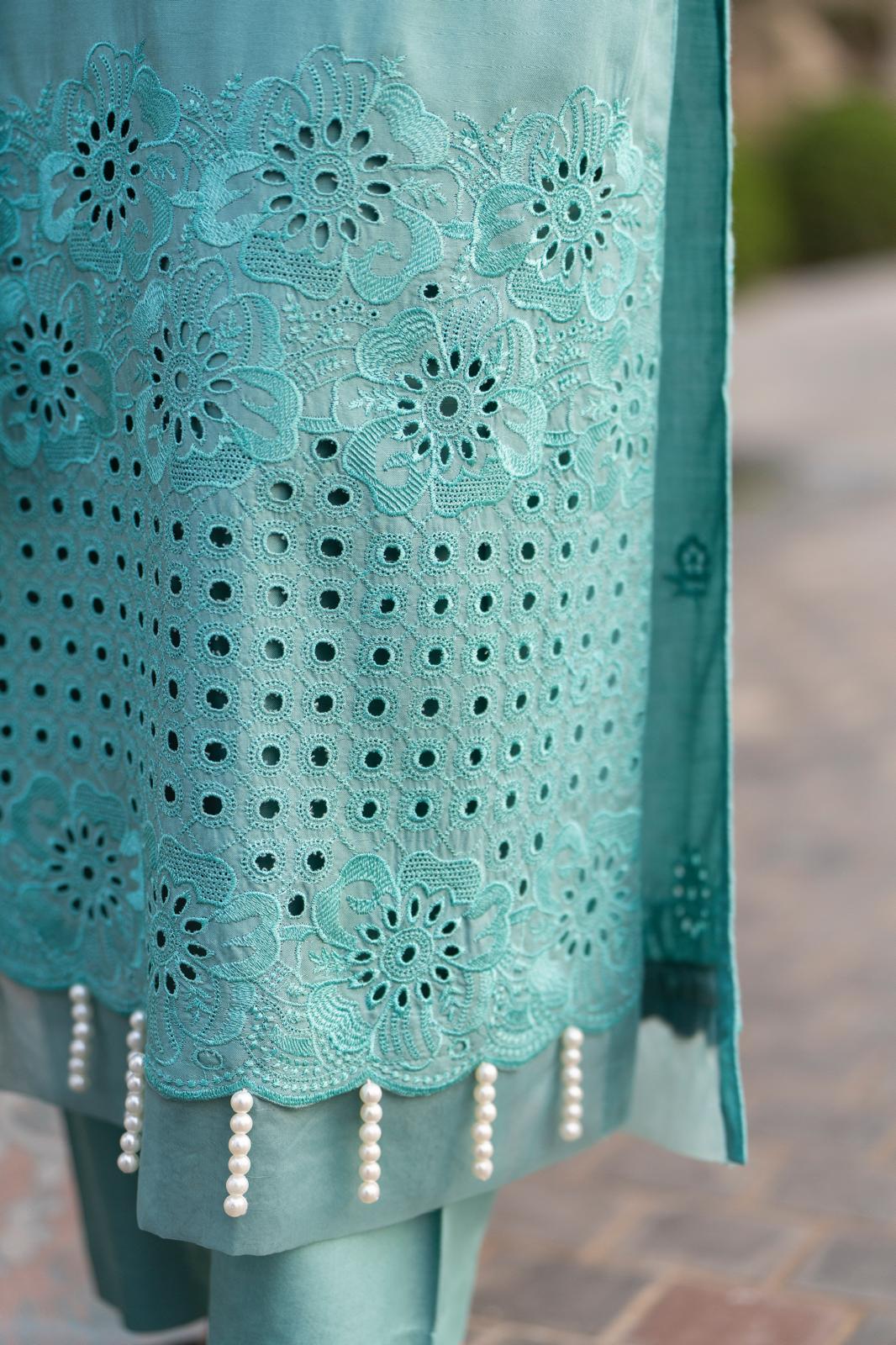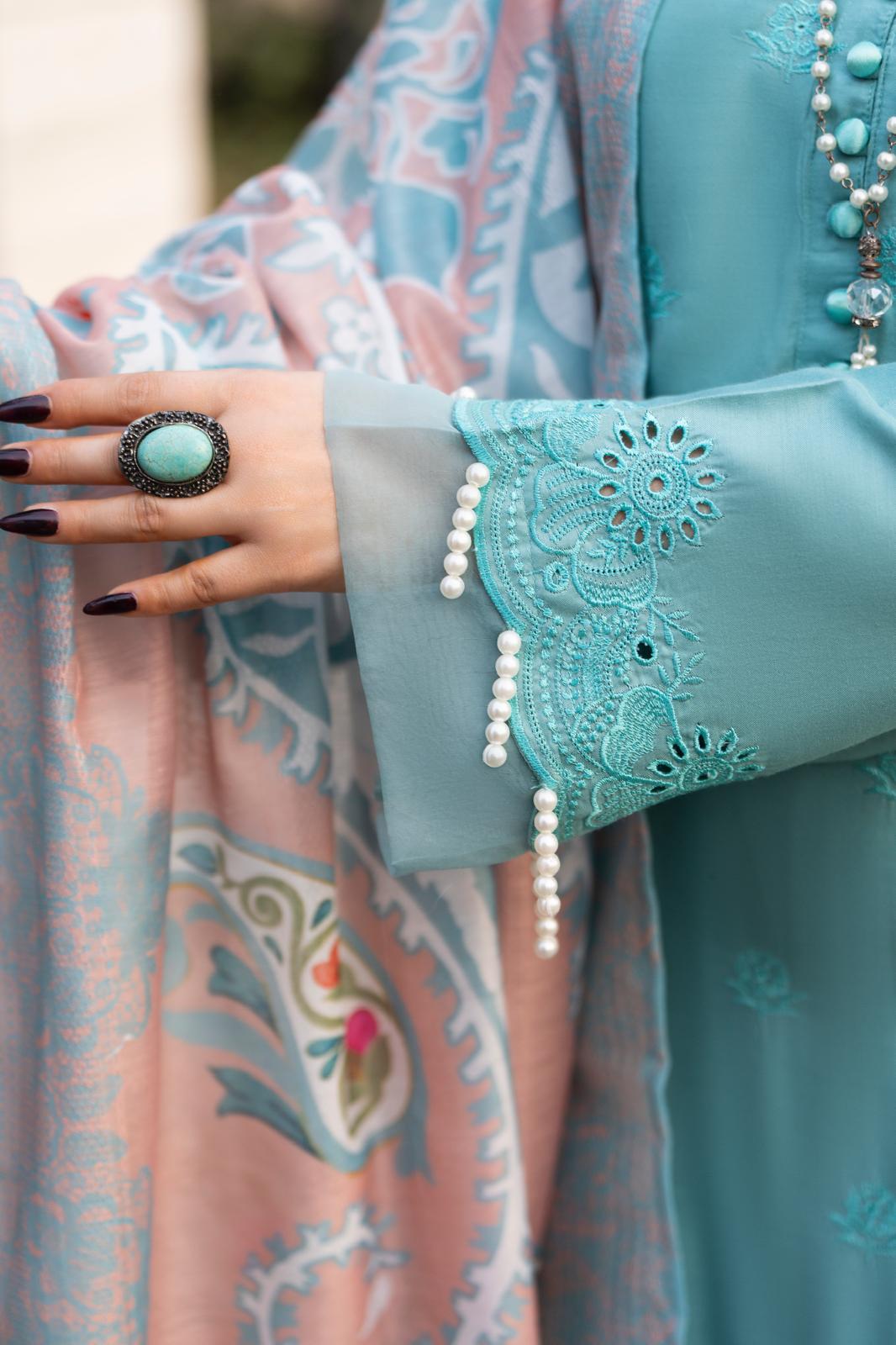 Discover elegance redefined with Zehra, a 3-piece chikankari masterpiece. The straight-cut design boasts intricate embroidery and cutwork detailing on the hem and sleeves. Paired with a delicate printed dupatta, this ensemble embodies effortless sophistication for Eid and festive celebrations.
